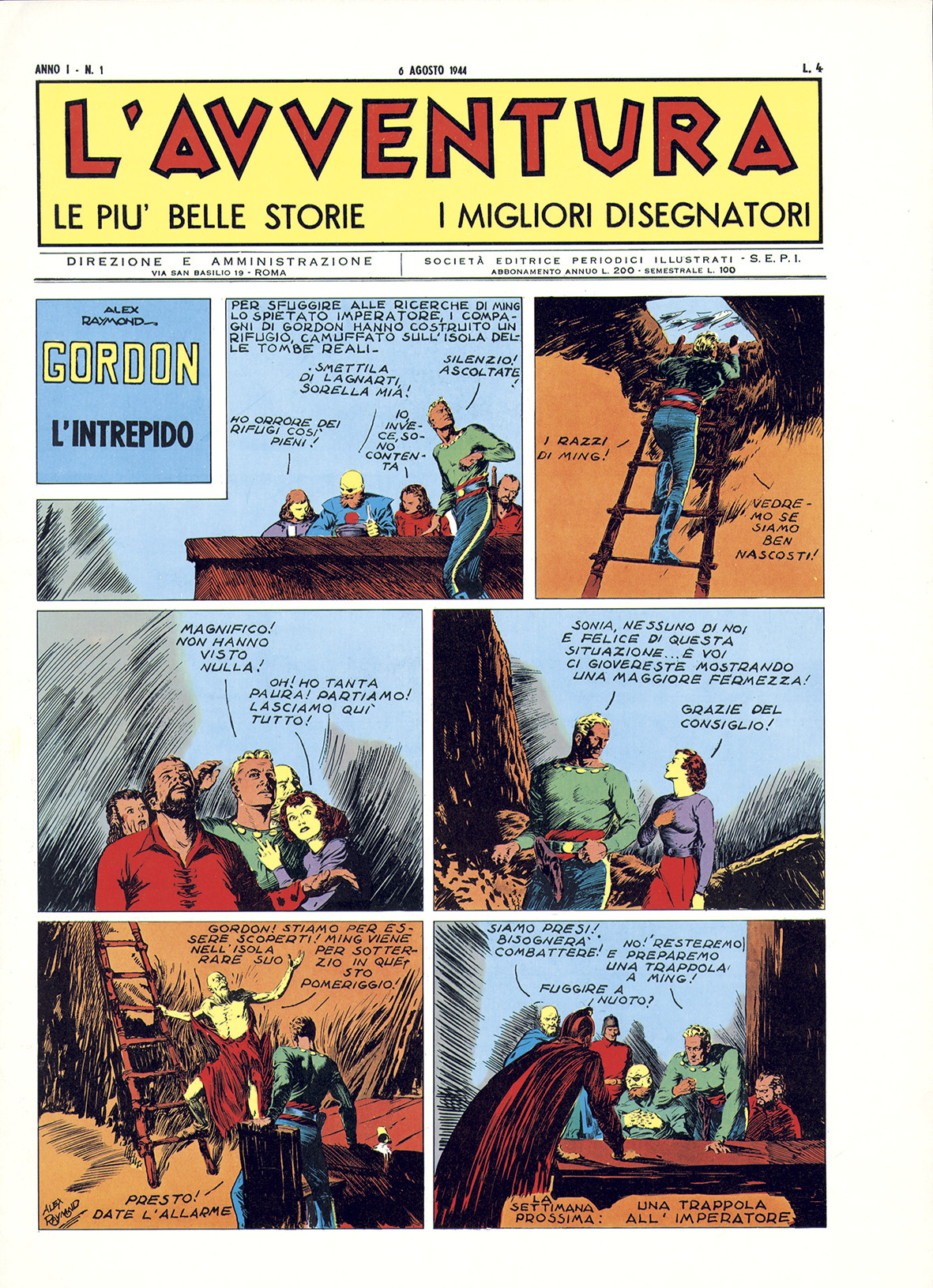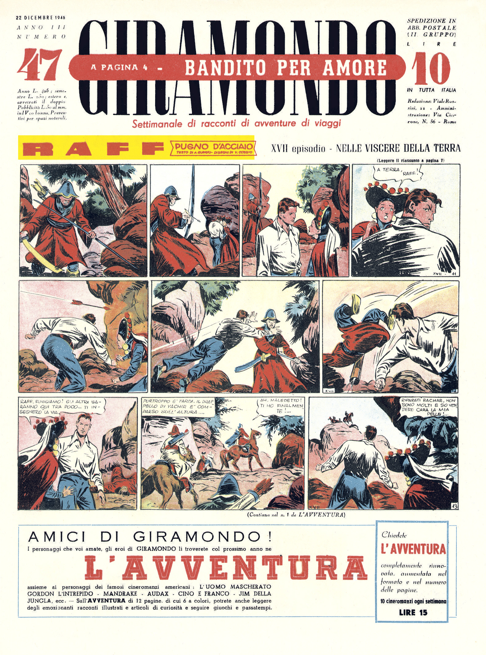 Già il 6 agosto 1944, appena due mesi dopo la liberazione di Roma, il tipografo romano Fausto Capriotti manda in edicola il settimanale L’Avventura, ideale continuazione dell’esperienza anteguerra dell’Avventuroso di Mario Nerbini. Vi sono pubblicati classici come Flash Gordon (Gordon l’Intrepido), King of the Royal Mounted (Audax), Tim Tyler’s Luck (Cino e Franco), Mandrake the Magician (Mandrake), Jungle Jim (Jim della giungla), Brick Bradford (Marco Spada), The Phantom (L’Uomo Mascherato). In questo momento di grande fermento per il fumetto nella capitale prende vita, sempre per iniziativa di Capriotti, anche la testata “gemella” Giramondo (agosto 1944). A questo foglio “di racconti, di avventure, di viaggi” lavora un gruppo di sceneggiatori come Gastone Martini, Sandro Cassone e Alberto Guerri; tra i molti disegnatori ci sono Mario Guerri (fratello di Alberto), Gaspare De Fiore, Renato Polese, Osvaldo Grassetti e Vittorio Cossio. Quest’ultimo insieme ad Alberto Guerri firma le avventure di Raff Pugno D’acciaio che diventa presto il personaggio di copertina.