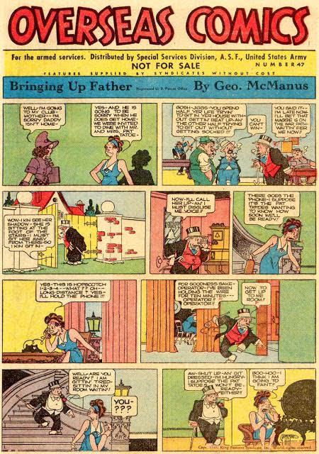 In quegli stessi anni, uno strumento importante per la diffusione del fumetto americano nel nostro Paese è rappresentato da due giornali: Jeep Comics e Overseas Comics. Entrambe le testate non erano destinate alla vendita ma venivano distribuite gratuitamente alle forze armate in Europa a cura della Divisione dei Servizi Speciali dell’esercito americano. Due erano i centri organizzativi e di stampa: uno a Parigi e un altro proprio a Roma. I colorati fascicoli, realizzati su carta da quotidiano, contenevano raccolte di tavole domenicali messe a disposizione dai vari syndicate. Vi compaiono in copertina serie come Bringing Up Father di George McManus, o Flash Gordon di Alex Raymond, che gli italiani avevano potuto apprezzare già da prima della guerra; ma ci sono anche personaggi per noi nuovi, come Dick Tracy di Chester Gould, o appena pubblicati, come Rip Kirby (1946) di Alex Raymond. Questo materiale inizia a circolare anche negli ambienti universitari e stimola una ripresa dell’attività editoriale volta, almeno in un primo tempo, a riallacciare il filo della pubblicazione dei “classici” americani, interrotto dall’autarchia culturale fascista.