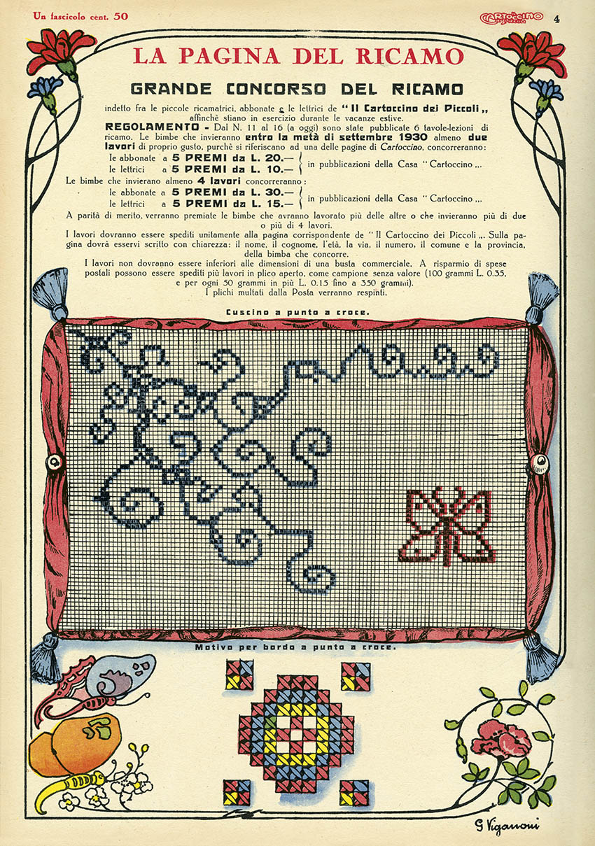 La “Pagina della costruzione” – tra le sezioni più popolari della rivista – ospitava ad esempio forme sempre diverse da ritagliare secondo le istruzioni e da montare per ottenere dei modellini; la “Pagina del ricamo”, rivolta alle “piccole ricamatrici”, impartiva loro i rudimenti del mestiere con esempi di lavoretti da svolgere in autonomia, mentre la “Pagina dei concorsi per gli alunni” era destinata agli aspiranti pittori e disegnatori, chiamati a colorare delle vignette e a elaborare disegni a partire da uno spunto tematico. Un’altra rubrica a concorso, il cosiddetto “Tema quindicinale”, invitava a tradurre in testi una sequenza di immagini, stimolando la creatività dei bambini e permettendo loro di cimentarsi in un ruolo autoriale. Il premio: un pacco di pubblicazioni dell’editore Cartoccino, per un valore complessivo di 10 lire.