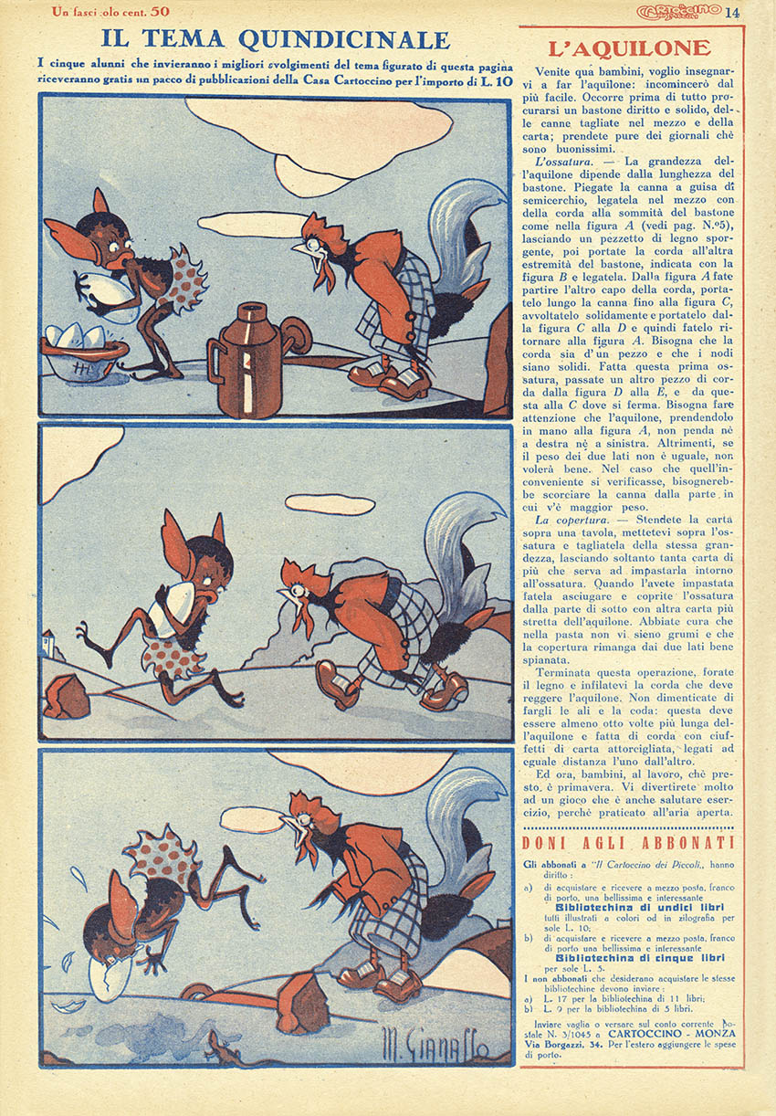 La novità più significativa era comunque di tipo contenutistico, e riguardava la notevole varietà di proposte didattico-ricreative offerte ai piccoli lettori in aggiunta all’usuale complesso di racconti e storie a vignette, tra le quali si annoveravano costruzioni da ritagliare, pagine istruttive, figure da colorare, concorsi e giochi a premi.