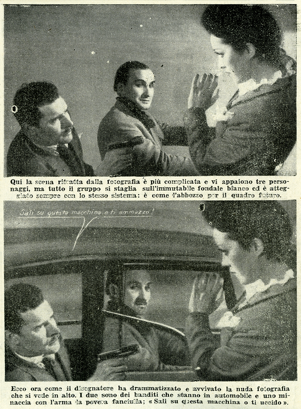 Il lato un po’ in ombra del fotoromanzo per il grande pubblico è sempre stato, invece, la sua realizzazione tecnica. Oggigiorno si fa un gran parlare di concetti come realtà virtuale, realtà aumentata e non ci stupiamo più, neppure minimamente, di fronte a effetti video come il chroma key. Ebbene, già nell’epoca totalmente analogica del fotoromanzo esisteva qualcosa di simile: la mescolanza tra fotografie e disegno era lo strumento per sopperire alle difficoltà scenografiche e di ambientazione dei fotoromanzi. Un articolo del settimanale romano La Tribuna Illustrata dell’8 agosto 1948, intitolato “Silenzio, si scatta!”, mostra il dietro le quinte della realizzazione di un fotoromanzo.