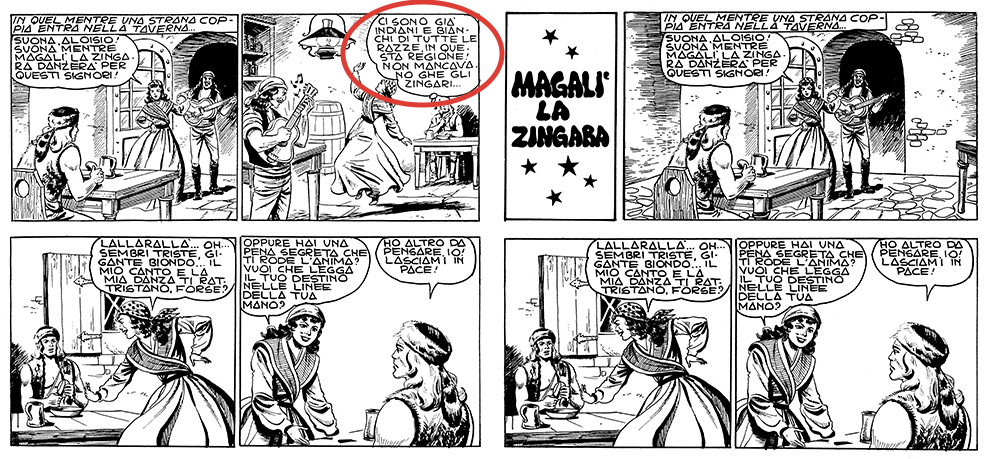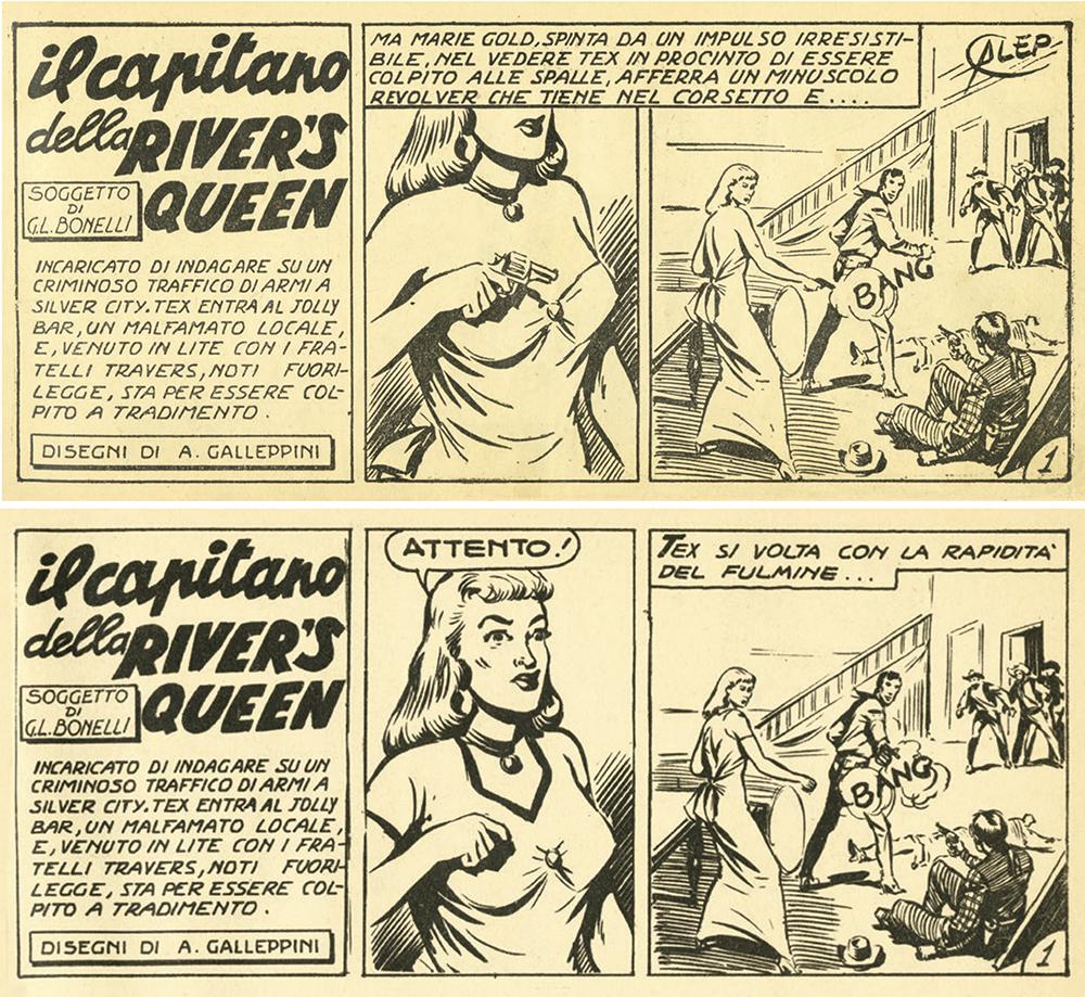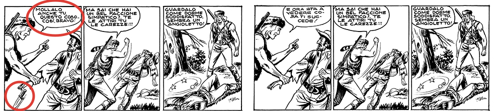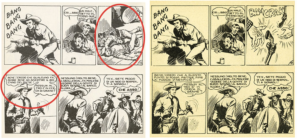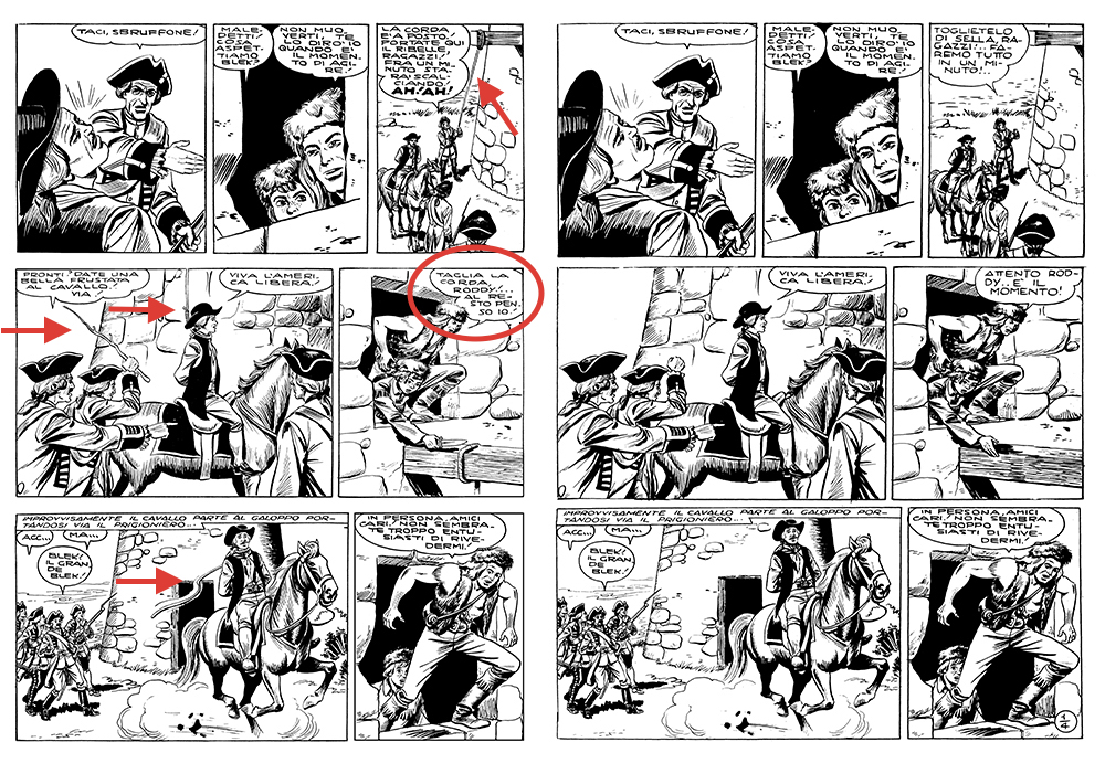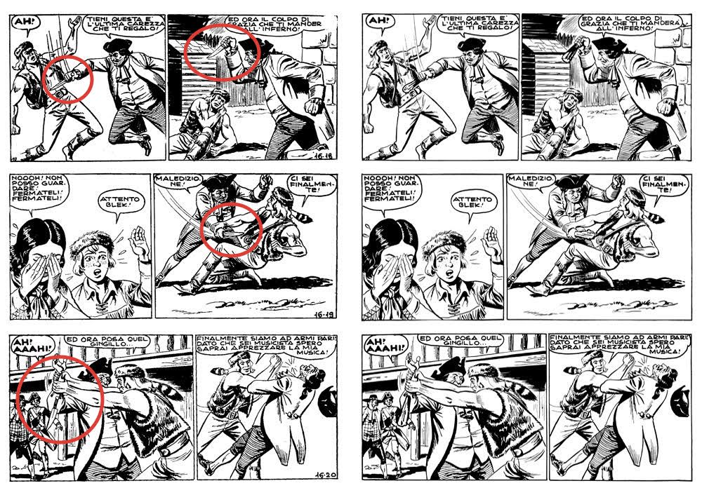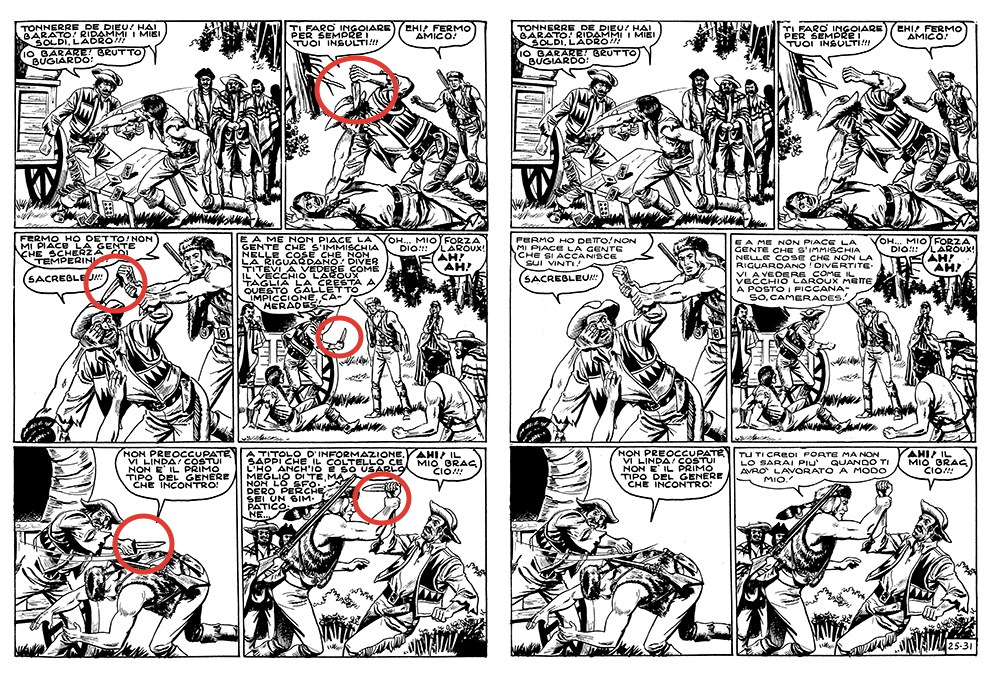 Mondadori però, a quanto pare, non era l'unico a rimaneggiare le proprie edizioni. Di recente abbiamo trovato esempi di censura anche nelle tavole di un personaggio insospettabile come il Grande Blek pubblicato dalla Dardo, un altro editore di successo che aveva tutto l'interesse a che le sue pubblicazioni non attirassero troppo l'attenzione delle varie liste di proscrizione in circolazione. Gli esempi di censure di Blek, che documentiamo qui per la prima volta, riguardano strisce comparse originariamente tra il 1955 e il 1957 e ritoccate sulle ristampe rimontate in formato Albo d'Oro della Collana Prateria (1956-1957). Tra i diversi esempi rinvenuti, abbiamo un'impiccagione giudicata, forse, un po' troppo cruenta; un apprezzamento decisamente razzista di Blek nei confronti di una zingarella e un duello al pugnale trasformato in una rissa a mani nude. Quest'ultima censura, in particolare, fa riflettere perché non è risultata essere un caso isolato. Anzi, altri esempi sembrano testimoniare una vera e propria fobia in casa Dardo per le lame, che nelle ristampe si squagliano come ghiaccioli al sole, lasciando i cattivi di turno del tutto disarmati o muniti di nodosi randelli sostitutivi.