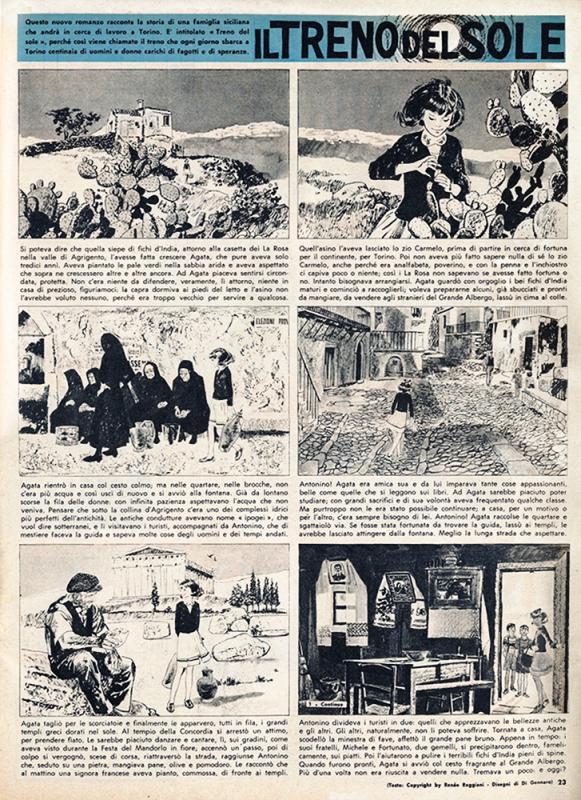 Nel 1961, una sua illustrazione marinara è notata dallo staff del CORRIERE DEI PICCOLI, che gli chiede di disegnare alcune immagini per “Viaggio al centro della Terra” riduzione dell’omonimo romanzo di Jules Verne. L’anno successivo esordisce anche come fumettista, grazie a “Il treno del sole”, una storia che racconta la vicenda di alcuni immigrati che dalla Sicilia si trasferiscono a Torino, scritta da Renée Reggiani.