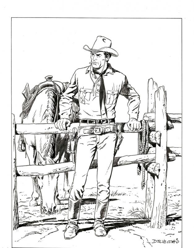 Nel 2007 il nuovo salto di qualità, esce infatti la sua prima storia di Tex Willer (“Soldi sporchi” e “Sandy Well”, TEX 561 e 562), nella quale dimostra di padroneggiare sia i personaggi (anche se dello storico quartetto inizialmente disegna solo Tex e Kit Carson) che gli ambienti, che porta sulla carta con un tratto corposo e pulito, davvero gradevole. Affidata al navigato Claudio Nizzi, la storia vede i due pard impegnati nel dare la caccia a un gruppo di indiani. Del Vecchio ha l’occasione per cimentarsi con alcune situazioni e luoghi entrati ormai a far parte dell’immaginario western, dalla carica di cavalleria al manipolo di soldati accerchiati, dal forte in legno al trading post nel deserto, dalla diligenza in fuga all’attacco indiano. Nel farlo è accurato e sicuro, attento nella distribuzione dei bianchi e dei neri, efficace nel tratteggiare i volti.
