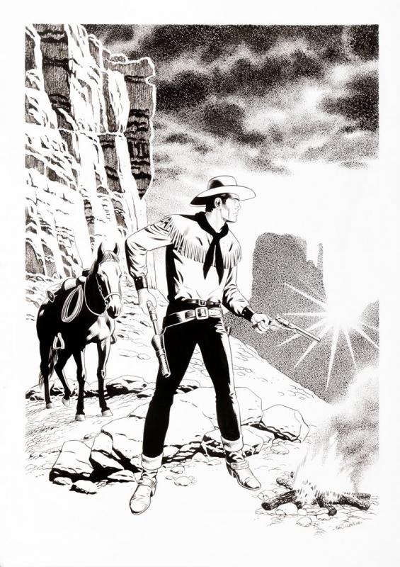 Ma il lavoro per Bonelli ormai lo assorbe completamente, specie quando entra a far parte del gruppo di matite di TEX, adibito a tale compito dall’editore non solo per l’indubbia qualità dei suoi disegni, ma anche per la maestria con cui sa portare sulla carta i cavalli e i paesaggi western. La sua prima storia di Tex, “I due Killers” appare sul numero 293 del 1985 ed è scritta da Claudio Nizzi.