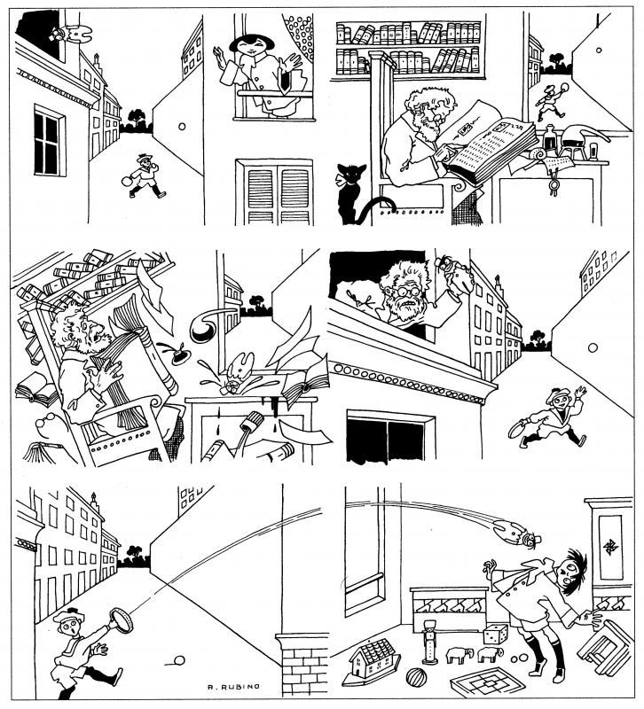 Nato a Sanremo il 15 maggio 1880, Antonio Rubino è senz’altro un artista a tutto tondo. Dopo aver lavorato in campo pubblicitario, Rubino inizia a collaborare nel 1907 al GIORNALINO DELLA DOMENICA e nel 1908 è tra i fondatori del CORRIERE DEI PICCOLI, di cui diviene un collaboratore fondamentale. A lui va attribuita la sostituzione delle abituali “nuvolette”, i cosiddetti balloons della tradizione fumettistica americana, con rime baciate a piè di vignetta.Dotato di un segno gradevole e artistico, in pieno stile liberty, Rubino inventa molti personaggi umoristici, alcuni famosissimi: QUADRATINO, PINO E PINA (1910), LOLA E LALLA, e poi Il COLLEGIO LA DELIZIA (1913), e tanti altri, fino a LIONELLO E NERONE (1926); disegna inoltre la versione italiana di molte strips statunitensi, come FORTUNELLO (Happy Hoolligan), LA CHECCA (And Her Name was Maud) e ARCIBALDO E PETRONILLA (Bringing up Father).