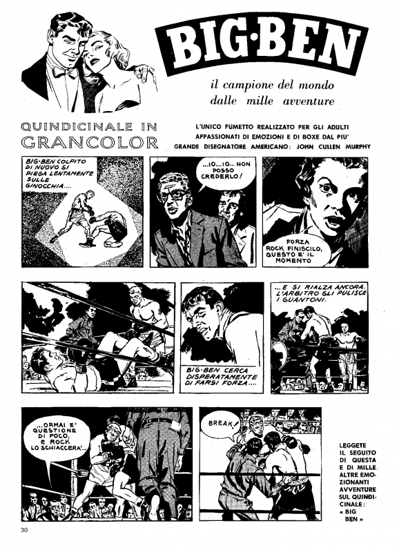 BIG BEN BOLT (senza il trattino nell’originale USA) è il campione di pugilato protagonista di una serie di strisce quotidiane iniziate il 20 febbraio 1950 (cui seguono le tavole settimanali dal 25 maggio 1952), sceneggiate da Elliot Caplin e disegnate da John Cullen Murphy. Dopo essere stato seriamente ferito a un occhio nel 1955, Bolt vive a lungo avventure fuori dal ring. A partire dal 1963, Murphy si fa sostituire sempre più di frequente da Al Williamson e Angelo Torres, poi, nel 1971, abbandona la strip per dedicarsi a Prince Valiant. Il disegnatore diventa allora Carlos Garzón, che cede poi i pennelli a Joe Kubert, a Gray Morrow ed infine a Neal Adams, il quale illustra le ultime strisce fino al 15 aprile 1978, quando il protagonista viene ucciso con una pallottola nel cuore da un sicario mentre pronuncia il suo discorso di accettazione del premio Nobel. Le sue avventure vengono pubblicate su LO SPORT ILLUSTRATO (1961); BIG-BEN (Astorina, 1961); CAPRICCIO D’AMORE (Astoria, 1961); COMICS RAMA (Bertelli, 1968); EUREKA (Corno, 1969); SORRY (Persona, 1973); EROI “I SEDICESIMI” (Ennio Ciscato, 1974).