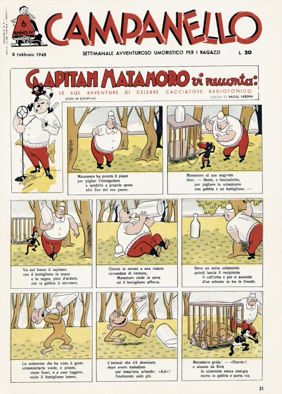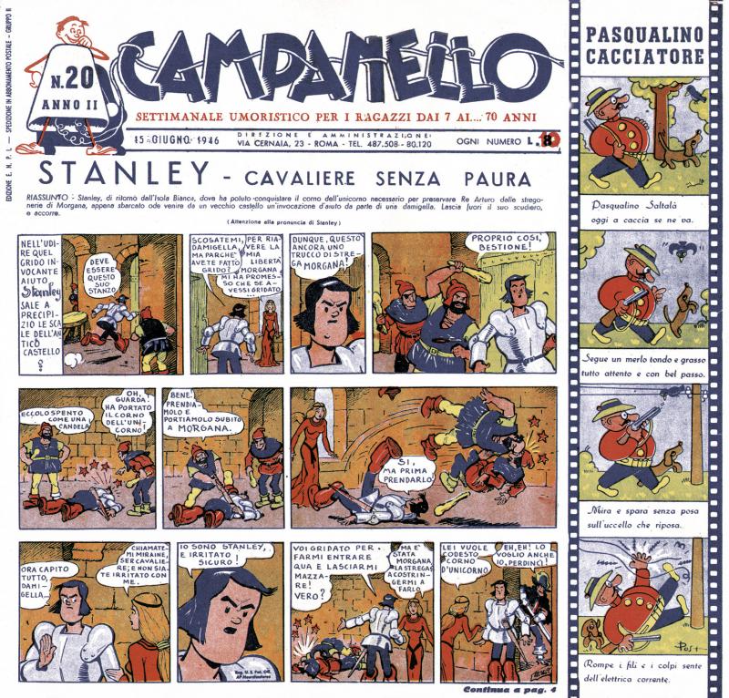 Presenta storie avventurose e umoristiche, sia di produzione statunitense (AP Features Service), come STANLEY cavaliere senza paura (Oaky Doaks) di R. B. Fuller e KETTY piccola stella americana di Hall, ripresa poi da Dyers, sia italiana, di giovani autori come Post (LA BANDA DEL GUFO), Lauria (GEPPI la bimba atomica), Giordello (GUERRIERO AZIO PELIGNO), Platania (PROSDOCIMO PANCETTA), Sergio (IL DRAGONE GIALLO). Dal 1946 diventa settimanale, il sottotitolo cambia in “Settimanale avventuroso umoristico per i ragazzi” e, con l’arrivo in redazione di Raul Verdini (che in precedenza aveva realizzato storielle comiche per IL BALILLA), cerca di sfruttare la popolarità di personaggi radiofonici come AVVENTURE DEL BARONE DI MUNCHAUSEN e CAPITAN MATAMORO vi racconta.