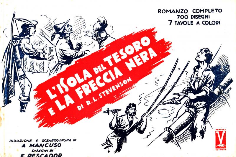 RC8 - “L’isola del tesoro/La freccia nera” - 25 novembre 1947. Raccoglie i nn. 31/34, 36, 38 e 40 (1946). Riduzione di A. Mancuso, disegni di Francesco Pescador. (MA)