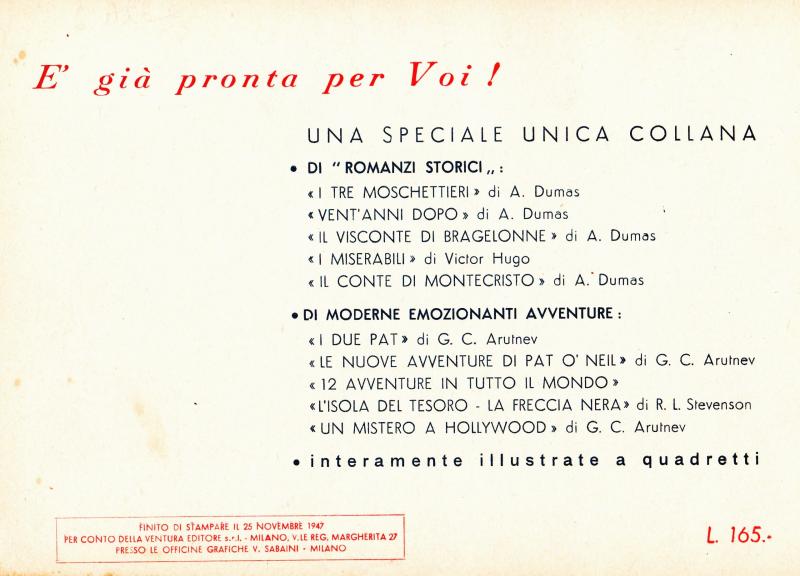 Collana contenitore presenta diverse serie: nel 1945 alterna I 3 MOSCHETTIERI (3M) (numeri dispari 1/13), testi di Antonio Mancuso, (Antony) disegni di Lina Buffolente, a I DUE PAT (DP) (numeri pari 2/12) testi di G. C. Ventura (Arutnev) e disegni di G. Andreoli. Nel 1946 è la volta di NUOVE AVVENTURE DI PAT O'NEIL (DP) (nn. 1/6, 13, 15) testi di G. C. Ventura (Arutnev) e disegni di G. Andreoli, che si alterna a VENT'ANNI DOPO (VD) (nn. 7/12, 14) di A. Mancuso e L. Buffolente; seguono IL VISCONTE DI BRAGELONNE (VB) (nn. 16/19 ), I MISERABILI (MI) (nn. 20/23) e IL CONTE DI MONTECRISTO (CM) (nn. 24/30) sempre di A. Mancuso e L. Buffolente; L'ISOLA DEL TESORO (IT) (nn. 31/33 ) e LA FRECCIA NERA (FN) (numeri pari 34/44) testi di A. Mancuso disegni di F. Pescador, che si alterna con la SERIE K (SK) (numeri dispari 35/45) testi di C. Worth, Amilcare Medici, Luigi Grecchi, disegni di Francesco Pescador.
