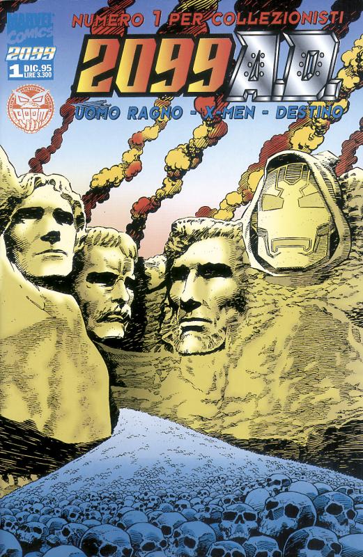 Collana contenitore che raccoglie l’eredità de L’UOMO RAGNO 2099 e X-MEN 2099. Presenta storie degli eroi Marvel ambientate nel futuro: DESTINO 2099, L’UOMO RAGNO 2099, X-MEN 2099, DOOM 2099. Per gli episodi di DESTINO 2099, testi di Warren Ellis, disegni di Pat Broderick, David Klein (disegnatore ospite nel n. 3), John Royle, Scott Koblish. Per L’UOMO RAGNO 2099, sceneggiature di Peter David, John Peterson, matite di Roger Robinson, Andrew Wildman, Keith Pollard, Joe St. Pierre, Ron Lim. Per X-MEN 2099, testi di John Francis Moore, Ian Edginton, disegni di Ron Lim, Steve Pugh; per DOOM 2099, sceneggiature di Warren Ellis, disegni di Steve Pugh, Ashley Wood e John Buscema. Nel n. 4 (febbraio 1996) sono pubblicati alcuni schizzi sulla genesi di VENOM 2099 di John Romita e Darren Auck; per le copertine, sketch di Rick Leonardi. Il n. 7 (giugno 1996) contiene l’inserto MARVEL UNIVERSE 11. Nel n. 9 (agosto 1996) anteprima della serie Marvel X-NATION 2099 con sketchbook di alcuni personaggi e schizzi della copertina del primo numero di Humberto Ramos.