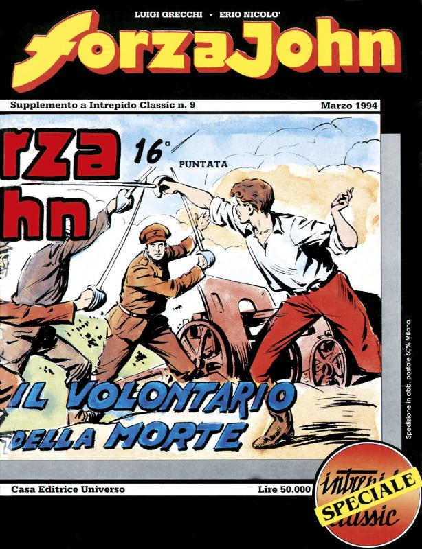 FORZA JOHN - nn. 1/9 - suppl. a INTREPIDO CLASSIC - Casa Editrice Universo - marzo 1994/marzo 2001 - 234 > 168 pgg. + cop. - cm 21 x 27,5 dq - Misto > 4 + 4 - Lire 50.000 > 35.000 > 40.000. Ristampa cronologica delle strisce, tre per pagina, delle due serie, riprodotte dalle tavole originali.