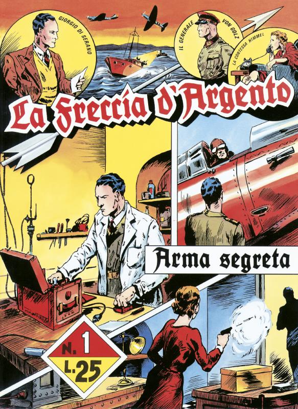 La serie aviatoria FRECCIA D’ARGENTO, scritta da Matteo Macciò e disegnata da Carlo Cossio, G. Petronio, Giuseppe Cappadonia e Ferdinando Vichi, viene pubblicata sul settimanale INTREPIDO Giornale (Universo, 1940 e 1945) dal 5 giugno 1940 al 12 ottobre 1943 e, dopo l’interruzione dovuta agli eventi bellici, ripresa con il n. 1 del 21 aprile 1945 sino al n. 50 del 1947 per i testi di Domenico Del Duca e i disegni di R. Ferrari, Averardo Ciriello, Pier Lorenzo De Vita, Enrico Bagnoli, Bernardo Leporini. Vengono pubblicati in totale 10 episodi, di cui i primi quattro (ma in trealtà ne escono solo tre) in albo super gigante orizzontale nella collana ALBI DELL’INTREPIDO (1) (Universo, 1940/41). Esiste anche una serie omonima, disegnata dall’inglese Fred Meagher, pubblicata dal n. 60 (23.02.35) al n. 91 (28.09.35) de L’AUDACE (1) (Vecchi, 1935).