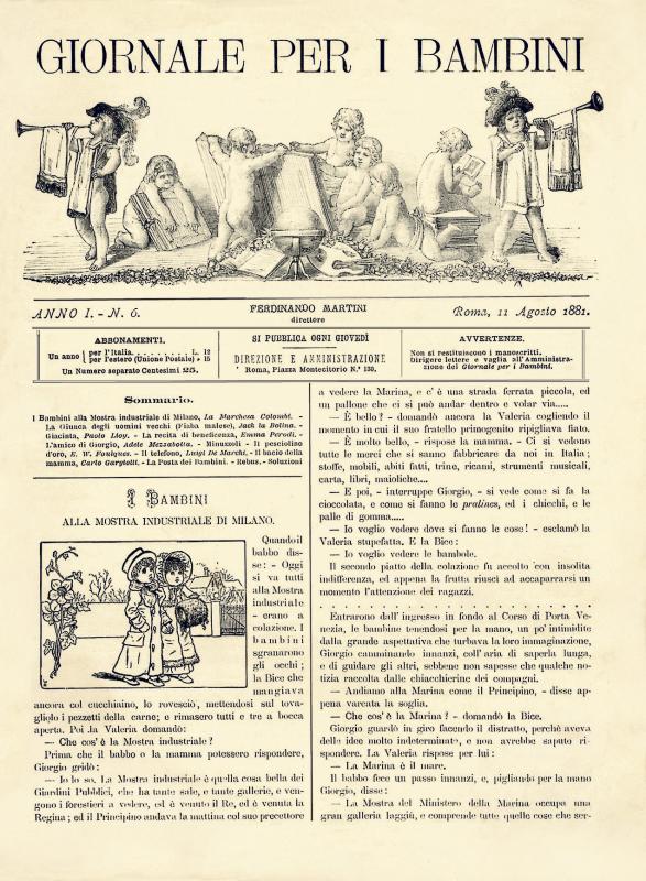Settimanale edito a Roma tra il 7 luglio 1881 e il 27 giugno 1889 (dr: Ferdinando Martini - 16 pgg. autocop. - cm 21,5 x 29,5 pc - Bianco e nero - Cent. 25 - St: F.lli Bencini). Primo periodico italiano a rompere con la tradizione ottocentesca delle pubblicazioni per l’infanzia. Fondato da Ferdinando Martini e redatto dagli stessi autori del celebre «Fanfulla», nasce con l’obiettivo di diventare per i ragazzi quello che gli adulti era il settimanale «Il Fanfulla della domenica». Presenta racconti, novelle e romanzi a puntate scritti da illustri autori quali Ida Baccini, Emma Perodi, Luigi Sailer, Enrico Nencioni, Salvatore Farina, Emilio De Marchi, Luigi Capuana, Pietro Dazzi, Matilde Serao, Sofia Albini, Ulisse Poggi, Anna Vertua Gentile, Guido Mazzoni, Guido Carocci e Giuseppe Giacosa. Proprio su questa testata, inoltre, esordisce il PINOCCHIO di Carlo Lorenzini (Collodi), apparso a puntate con il titolo di “Storia di un burattino” nel 1881 e intervallato da vignettine di Ugo Fleres. Interrotto al diciassettesimo capitolo con l’impiccagione del protagonista, il romanzo viene ripreso da Collodi, costretto dalle proteste dei lettori a cercare un finale diverso, e pubblicato in volume due anni più tardi. In generale comunque il GIORNALE PER I BAMBINI dà ampio spazio alle illustrazioni, inizialmente tratte da periodici stranieri e via via sostituite da quelle di produzione italiana. Pubblica anche storie di MAX e MORITZ (qui ribattezzati I MONELLI DI CORINTO) del tedesco Wilhelm Busch. Il giornale chiude il 27 giugno 1889 per confluire nel GIORNALE DEI FANCIULLI dei Fratelli Treves.