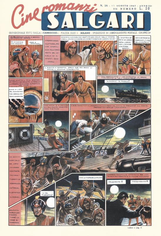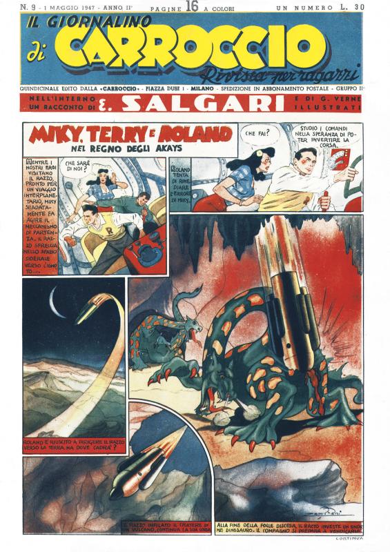 Testata contenitore diretta da Gino e Renzo Boschi che pubblica prevalentemente materiale di genere avventuroso. Presenta il racconto fantascientifico “Miki, Terry e Roland nel regno degli Akays” di Ettobos e Zamperoni, VOLPE in “Volpe contro Huerta il bandito”, SAETTA in “La freccia cinese”, soggetto, sceneggiatura e disegni di Guido Zamperoni; “Cristiano il Corsaro” di Luciano Pedrocchi e Bernardo Leporini; MACARIETTO; “Il padrone del mondo”, basato sull’omonimo romanzo di Giulio Verne, illustrazioni di Tac; “Freccia d’oro” di C. De Mattia e Giorgio De Gaspari; “Il principe e il povero”, riduzione a fumetti e didascalie illustrata da Giacinto Galbiati del racconto di Mark Twain; "I Pirati della Malesia" di E. Salgari e Corbella; "Il figlio del Corsaro Rosso" di E. Salgari e Zamperoni e la serie umoristica “Celestino al centro della Terra”, in cui debutta un giovanissimo Gian Battista Carpi. Inoltre disegni di Roberto Sgrilli, Ferdinando Corbella, De Gaspari, Orsi, Rino Albertarelli, Massaro, Pellizza e Alessio. Dal n. 16 (15 agosto 1947) la testata diventa CINEROMANZI SALGARI già riportato in ultima di copertina sin dal n. 12.