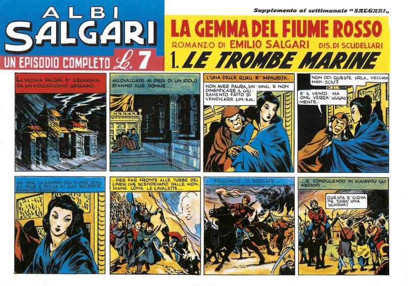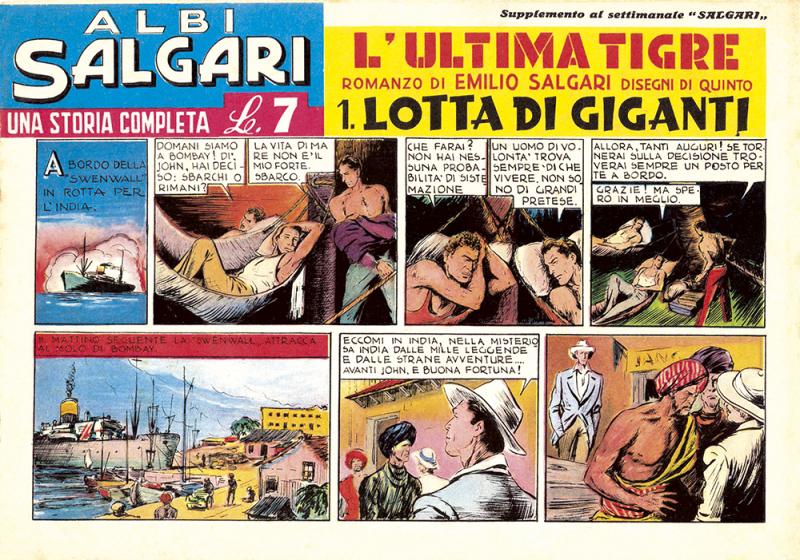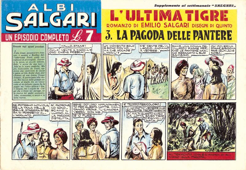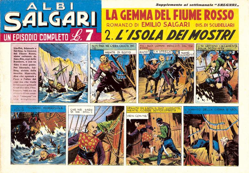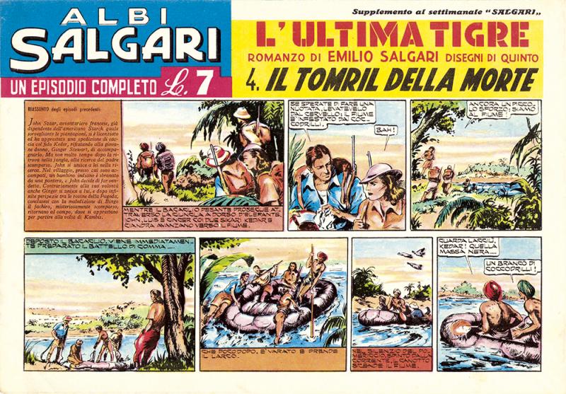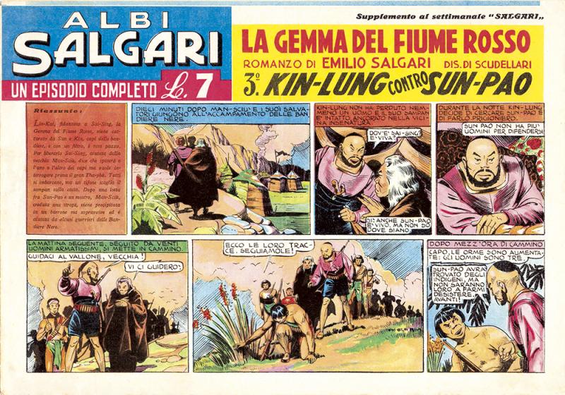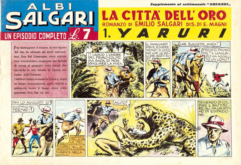 Gli albi escono in blocchi di quattro alla volta, come supplementi al giornale SALGARI con cadenza mensile. Presentano i cicli “La gemma del fiume rosso” (n. 1, 2, 7, 9, 13, Giorgio Scudellari), “L’ultima tigre” (nn. 4, 8, 10, 14, Nadir Quinto), “La città del lebbroso” (nn. 5, 6, 11, V. Maffi) e “La città dell’oro” (n. 12, Enzo Magni) e altre storie brevi disegnate da Raffaele Paparella (nn. 3, 16) e Franco Chiletto (n. 15). Annunciato, ma mai pubblicato, un quinto lotto di altre quattro storie. In ultima pagina c'è il concorso "Chi farà parlare il giornale muto?", una serie di 16 gag da fumettare.