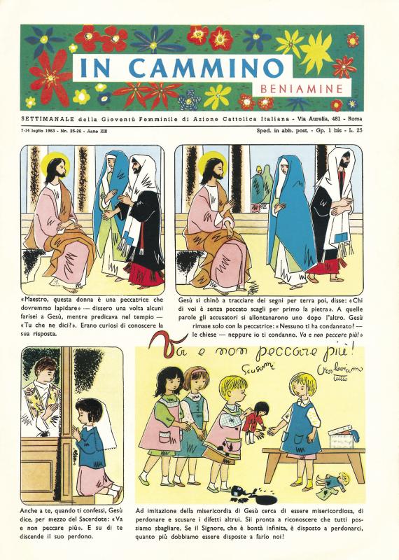 IN CAMMINO BENIAMINE Settimanale per la gioventù femminile di A.C. italiana, direttore responsabile Anna Tolentino, poi Giuliana Biondi. Il primo numero risale al gennaio 1949. Esce fino al n. 43 del 15 dicembre 1963, Anno XV (8 > 4 pgg. autocop. - cm. 21 x 30 - Lire 30 > 25). Contiene racconti, rubriche con notizie dal mondo, informazione religiosa e catechetica. Disegni e illustrazioni di Luisa Fantini e Mimi. Personaggi fissi: CURIOSINA (1953, Fantini). Mimi illustra proverbi e galateo.
