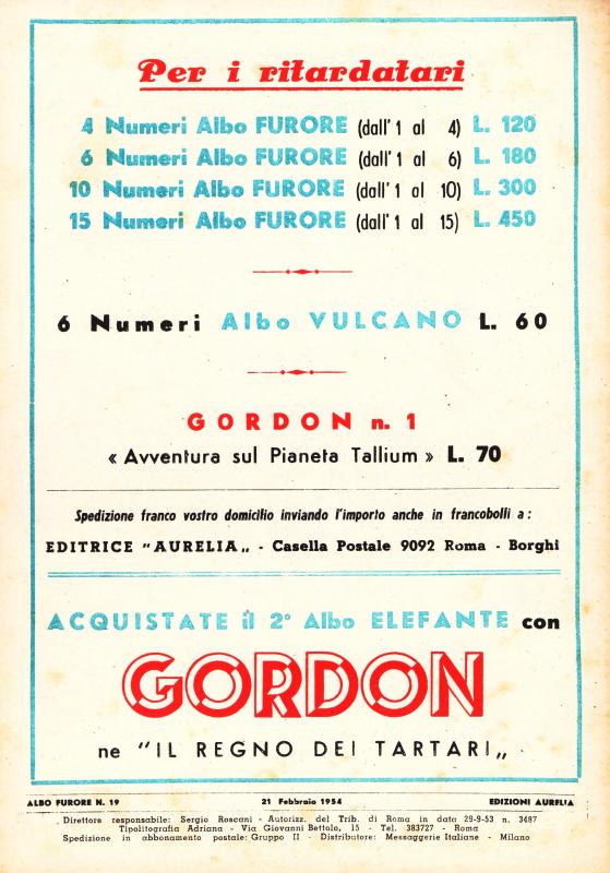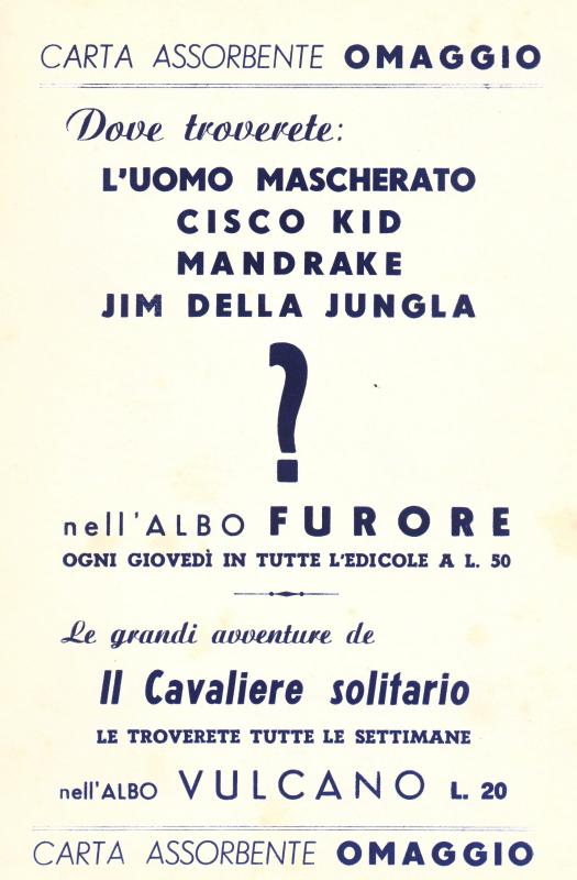 Gli albi vengono riproposti in quattro volumetti che escono come Supplemento ALBO FURORE a collana già chiusa (160 > 180 pgg. + cop. - cm 16,5 x 23 dq - Lire 120). In IV di copertine pubblicità cumulativa di testate di altri editori, tutti distribuiti dalle Messaggerie: CUCCIOLO (Alpe), GRAZIELLA (Ed. Graziella), La Scienza Illustrata e La Domenica della Donne (Alcol).