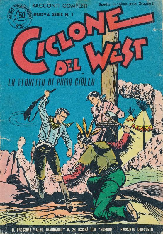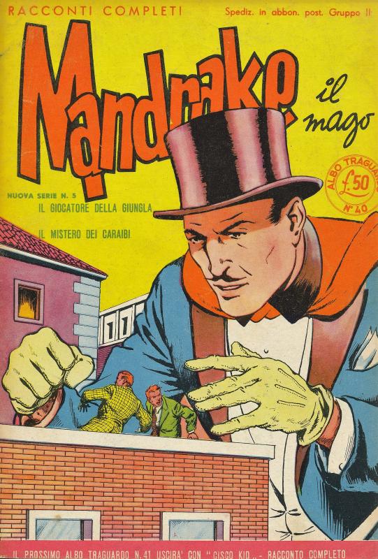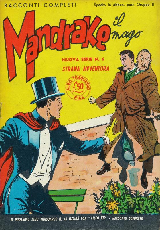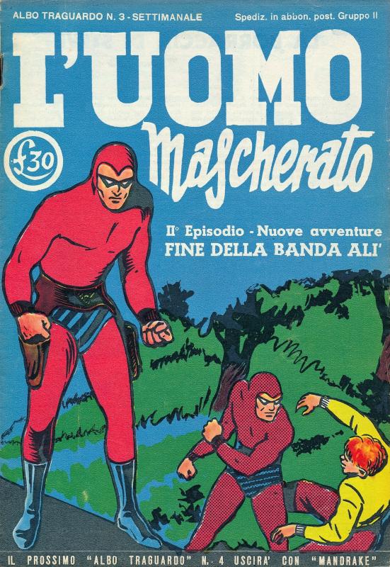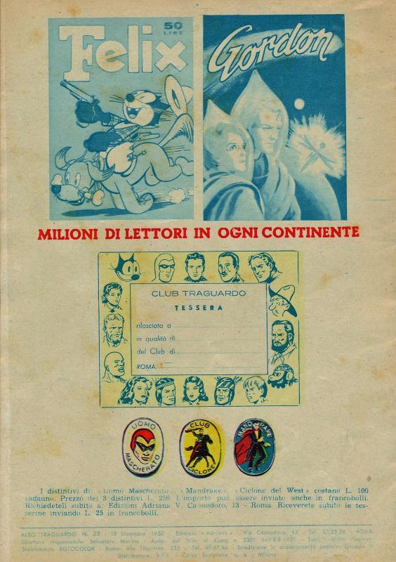 Per i primi 24 numeri presenta esclusivamente le avventure de L’UOMO MASCHERATO (UM) di Lee Falk e Wilson McCoy (numeri dispari) e quelle di MANDRAKE IL MAGO (MA) di Lee Falk e Phil Davis (numeri pari) e così poi fino alla fine eccetto alcuni dedicati a CICLONE DEL WEST (CW) (25, 29 e 33), GORDON (FG) di Mac Raboy e Dan Barry (26, 30, 34, 38 e 42), CISCO KID (CK) di José Luis Salinas (37, 41, 45, 49 e 53) e JIM DELLA JUNGLA (JJ) di Paul Norris (46, 50 e 54). In appendice le avventure de IL SERGENTE PAT DI RADIO PATTUGLIA di Eddie Sullivan e Charlie Schmidt e le tavole domenicali autoconclusive di HUBERT di Dick Wingert. Dal n. 23 (18 dicembre 1952) in copertina appare la scritta “Nuova serie” e la doppia numerazione, quella della collana che prosegue e quella dei singoli personaggi che ricomincia dal n. 1: L’UOMO MASCHERATO (23=1), MANDRAKE (24=1), CICLONE DEL WEST (25=1), GORDON (26=1), CISCO KID (37=1) e JIM DELLA JUNGLA (46=1). La grafica della testata cambia con i nn. 20 (28 novembre 1952), 23 (18 dicembre 1952) e 35 (12 marzo 1953). Annunciato, ma mai pubblicato, il n. 56 (MANDRAKE). Le storie rimaste incompiute proseguono su ALBO FURORE (Edizioni Aurelia). L’editore bandisce un concorso a premi e realizza la Tessera Club Traguardo nonché i distintivi de L’UOMO MASCHERATO, di MANDRAKE e di CICLONE (in vendita a Lire 100). Due le raccolte di figurine “Raccolta Traguardo” e “Album dello sport”.