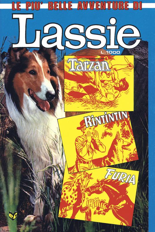 RC2 - LE PIÙ BELLE AVVENTURE DI FURIA > LASSIE > RINTINTIN & Rusty > TARZAN - nn. (1/4) - luglio 1979 - 208 pgg. + cop. - cm 16,5 x 25 - Misto - Lire 1.000. Escono 4 albi non numerati, con differente testata, ognuno dei quali raccoglie un numero di FURIA, uno di LASSIE, uno di RIN TIN TIN & Rusty ed uno di TARZAN. L'albo con testata LASSIE esce come suppl. a SILVESTRO SHOW n. 4 (luglio 1979), quello con testata FURIA come suppl. a Super FURIA n. 3 (luglio 1979), quello con testata RIN TIN TIN come suppl. a Raccolta Speciale RIN TIN TIN n. 3 (luglio 1979), quello con testata TARZAN come suppl. al n. 4 di TARZAN (luglio 1979).