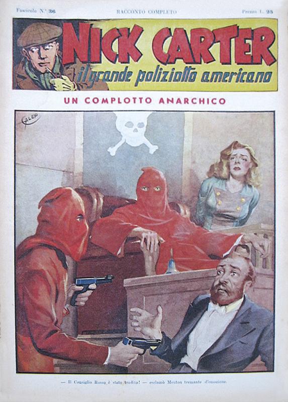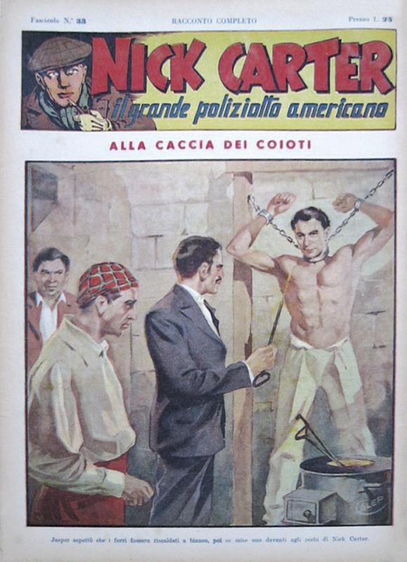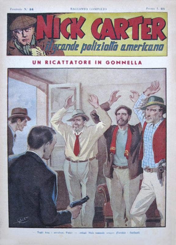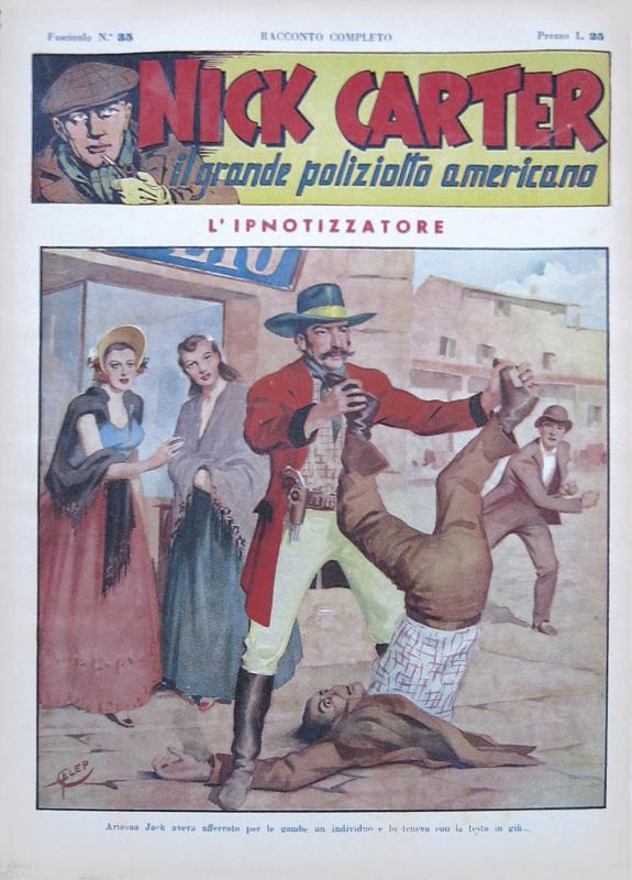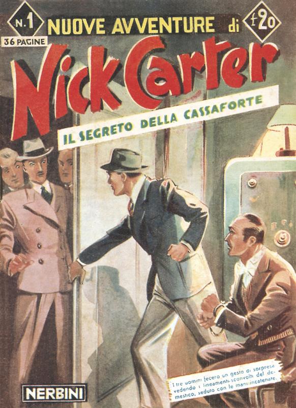 Detective letterario creato da John Russel Coryell nel 1886. In Italia il personaggio originale ha fatto il suo esordio in una collana omonima edita a partire dal 1907 dalla Casa Editrice Americana, succursale delle edizioni tedesche di Alwin Eichler. Dal 1919 è passato alle edizioni Nerbini, che l’hanno pubblicato in dispense dal grande formato e dal 1949 in una collana tascabile. Nel 1965 le edizioni E.P.I. hanno pubblicato una collana di romanzi gialli con NICK CARTER come protagonista. Nel 1970, per la trasmissione televisiva “Gulp, fumetti in TV”, Guido De Maria e Franco Bonvicini (Bonvi), ne realizzano una parodia animata che nella versione a fumetti è apparsa sulle pagine del CORRIERE DEI PICCOLI, CORRIERE DEI RAGAZZI (Corriere della Sera, 1972), ATTENTI A QUEI DUE (Cenisio, 1975) e SUPERGULP (Mondadori, 1978), EUREKA (Corno, 1975), COMIX (F. C. Panini, 1992) e in alcuni numeri unici usciti come supplemento a testate quali JONNY LOGAN (Dardo, 1972), MASCHERA NERA (Corno, 1977), SUPERALBO (Dardo, 1972), TITI’ (Cenisio, 1975). Nel 1972 e nel 1977 la Panini ha immesso sul mercato due album di figurine.