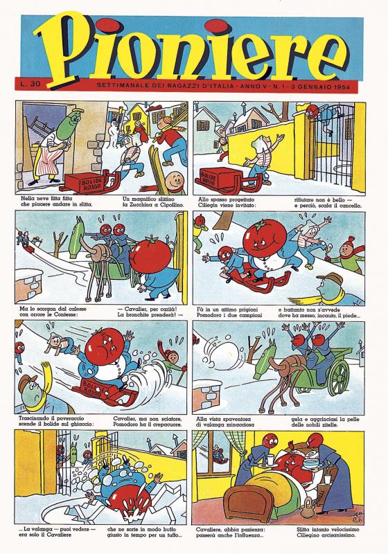 Raccolta l’eredità de IL MOSCHETTIERE > IL PIONIERE DEI RAGAZZI e dell'esperienza di NOI RAGAZZI (UDI, 191948), il settimanale, legato agli ambienti della sinistra italiana, si propone come alternativa al CORRIERE DEI PICCOLI e a IL VITTORIOSO, ospitando oltre ai fumetti e a rubriche di intrattenimento, spazi e spunti di riflessione di carattere civile e politico. Oggetto di forti polemiche anche da parte di rappresentanti della sinistra, la testata mantiene una forte identità grazie al team creativo composto oltre che dalla direttrice Dina Rinaldi, da Marcello Argilli e da Gianni Rodari. Tra le serie a fumetti pubblicate CHIODINO e ATOMINO di Marcello Argilli e Vinicio Berti (Ber), portabandiera della testata, CAPITAN BLOOD, BUFFALO BILL e AQUILA BIANCA di Paolo Bracaglia e Clario Onesti che disegna anche GABBIANO ROSSO, SAND E ZEOS di Bracaglia e Carlo Cedroni, CACTUS BILL di A. Cagnacci, ANIMALI PARLANTI di Flora Capponi, e storielline in rima scritte da Rodari e illustrate da Raoul Verdini, come CIPOLLINO, ARLECCHINO, PULCINELLA, LOLA E CALIMERO e PINOCCHIO. Nello staff dei disegnatori italiani, impegnati anche nella realizzazione di fumetti storico-avventurosi, Giovanni Sforza Boselli, Veniero Canevari, Carlo Peroni.