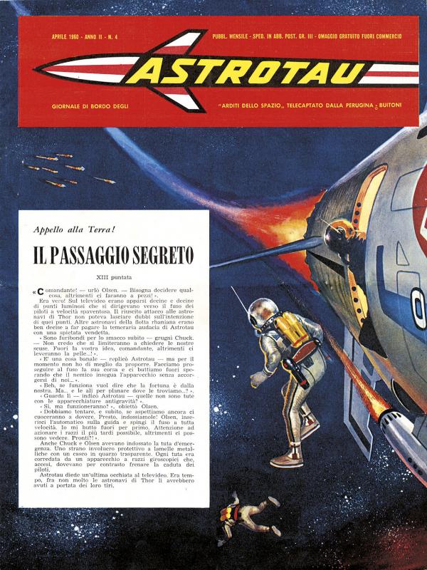 Giornale di bordo degli "Arditi dello Spazio" telecaptato dalla Perugina - Buitoni, edizione fuori commercio realizzata da Maria Bianchi e Mario Cottinelli. In ultima pagina TONI & GINA (che sta per BuiTONI e PeruGINA), una tavola a continuazione di produzione inglese (Fleetway Publications). Già apparso nel 1959.