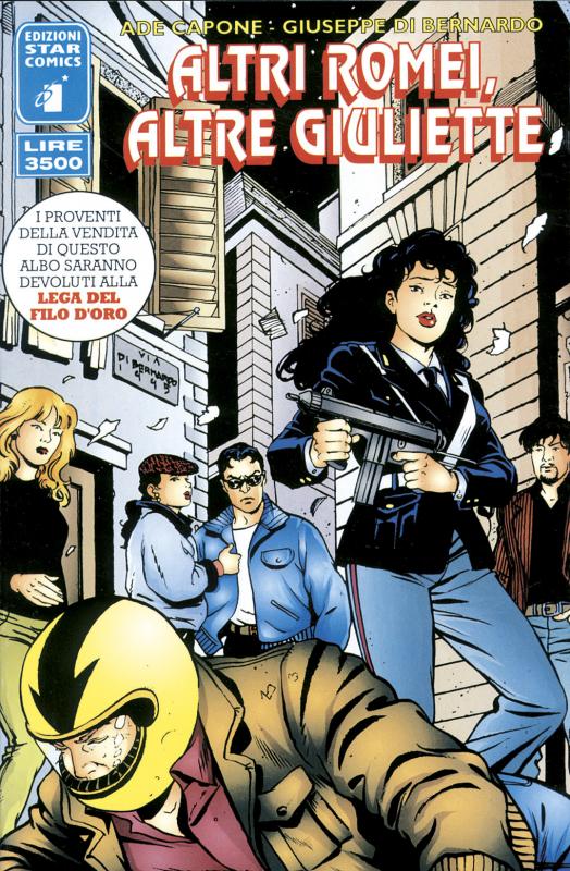 (02) - ALTRI ROMEI, ALTRE GIULIETTE - 1995 - 24 pgg. + cop. - Bianco e nero - cm 18 x 26 pm - Lire 3.500. Albo speciale realizzato appositamente per raccogliere fondi a favore della Lega del Filo d’Oro, un’associazione che si occupa di bambini sordo-ciechi. Soggetto e sceneggiatura di Ade Capone. Disegni, copertina e lettering di Giuseppe Di Bernardo. Colori di copertina Matteo De Benedittis.