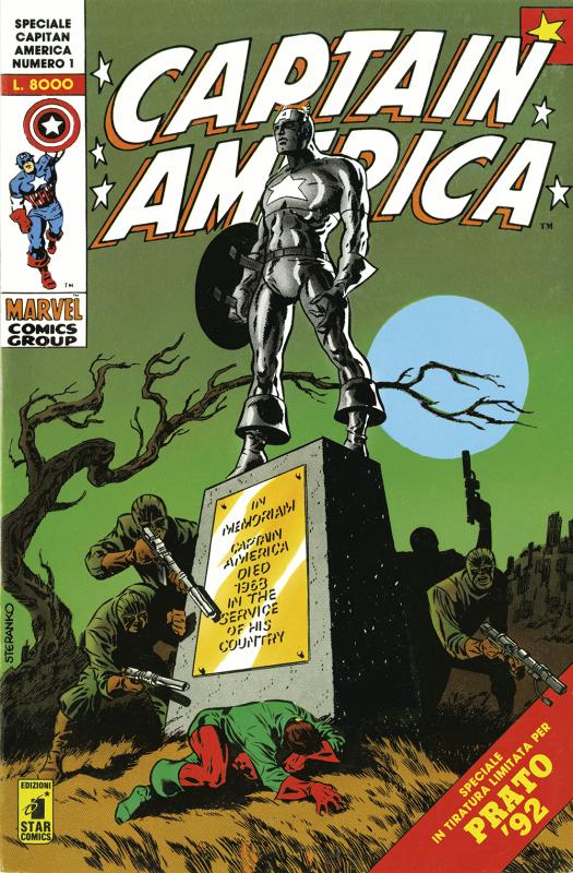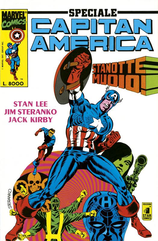 01 (21) - CAPITAN AMERICA Speciale “Stanotte muoio!” - suppl. a CAPITAN AMERICA & I VENDICATORI n. 41 - 20 marzo 1992 - pgg. 112 + cop. - cm 17 x 26 dq - 4 + 4 - Lire 8.000 - Esiste anche in versione variant cover per Prato Comics ‘92 e Treviso '92. Da «Captain America» nn. 109/113, già editi nella collana CAPITAN AMERICA nn. 25/28 (Corno, 1973). Testi di Stan Lee, matite di Jack Kirby e Jim Steranko.
