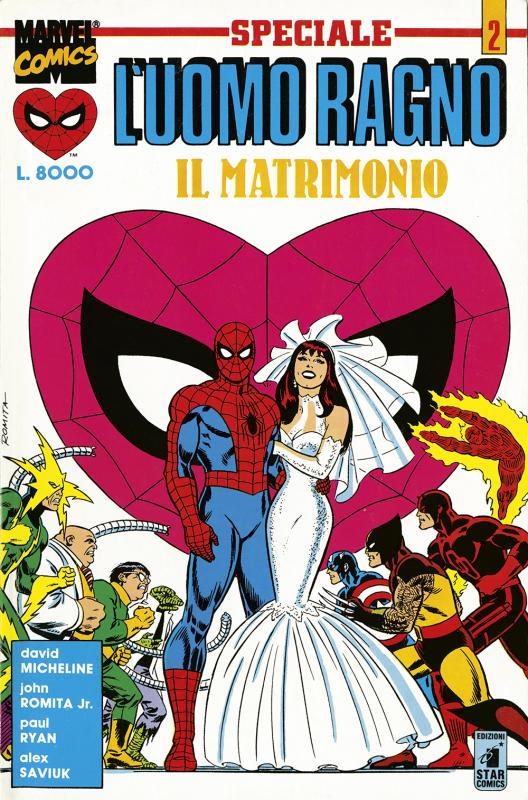02 (18) - L'UOMO RAGNO Speciale "Il matrimonio” - suppl. a CYBORG n. 7 - luglio/agosto 1991 - 112 pgg. + cop. - cm 17 x 25 dq - 4 + 4 - Lire 8.000. Di David Micheline, John Romita, Ryan, Saviuk. Esiste anche versione variant cover realizzata in occasione di Lucca Comics ’91 con copertina di Bill Sienkiewicz.