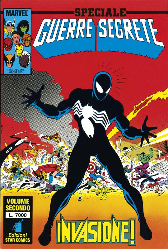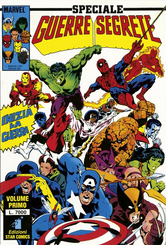 01 (07) - GUERRE SEGRETE Speciale “Inizia la guerra” - suppl. a CAPITAN AMERICA & I VENDICATORI n. 3 - marzo 1990 - 96 pgg. + cop. - cm 17 x 25 dq - 4 + 4 - Lire 7.000. Testi di Jim Shooter, matite di Mike Zeck. Da «Marvel Secret Wars» nn. 1/4. Primo esempio di crossover, ovvero di saga attorno alla quale si incrociano le serie regolari dei personaggi più famosi.