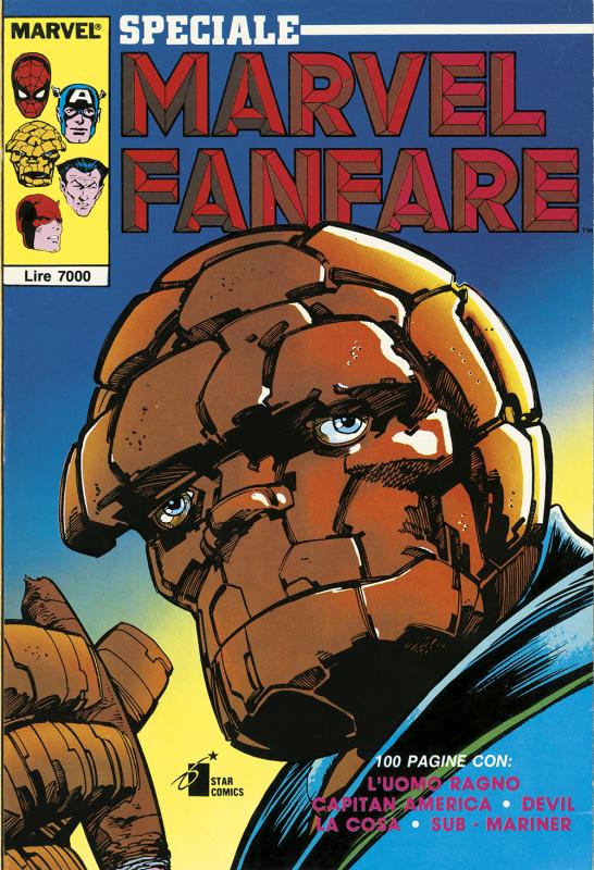 s.n. (10) - MARVEL FANFARE Speciale - suppl. a FANTASTICI QUATTRO n. 30 - 30 settembre 1990 - 96 pgg. + cop. - cm 17 x 25 dq - 4 + 4 - Lire 7.000. Tratto dalla rivista antologica Marvel Fanfare, pubblica storie che vedono come protagonisti CAPITAN AMERICA, UOMO RAGNO, LA COSA, DEVIL, SUB-MARINER e SCARLET. Testi di Roger Stern, Danny Fingeroth, Bill Mantlo, Mike Barr, Barry Windsor Smith e Marcel Hempel. Matite di Frank Miller, Tod Smith, Sandy Plunkett, Mike Mignola, Barry Windsor Smith e Marcel Hampel. Da «Marvel Fanfare» nn. 3, 6/7, 18, 27, 43, 46.