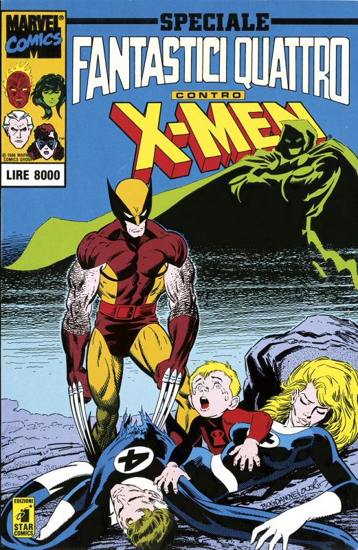s.n. (22) - FANTASTICI QUATTRO CONTRO X-MEN Speciale - suppl. a I FANTASTICI QUATTRO n. 67 - 30 aprile 1992 - 112 pgg. + cop. - cm 17 x 25 dq - 4 + 4 - Lire 8.000. Testi di Chris Claremont, disegni di Jon Bogdanove e Terry Austin. Esistono anche due versioni con copertina variant, pubblicate in occasione di Bari 1992 e di Lucca 1992.