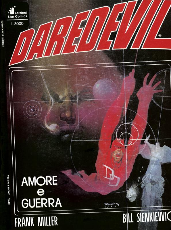 01 (05) - DAREDEVIL “Amore e guerra” - dicembre 1989 - 64 pgg. + cop. - cm 20,5 x 27,5 dq - 4 + 4 - Lire 8.000. Testi di Frank Miller, matite di Bill Sienkiewicz. Prima graphic novel dedicata al personaggio in stile pittorico.
