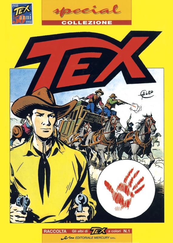 ES6 - GLI ALBI DI TEX A COLORI - 1996/2001 - Editoriale Mercury - 32 pgg. + cop. - cm 16, 7 x 24 pm - 4 + 4 - Lire 10.000. Ristampa a colori, rimontate a tre per pagina, le strisce di TEX (1) dal n. 1 della Serie I al n. 2 della Serie Verde. Gli albi possono essere conservati in appositi cofanetti di cartone. Le rese vengono raccolte dall’editore in una collana di volumetti cartonati > ES7.