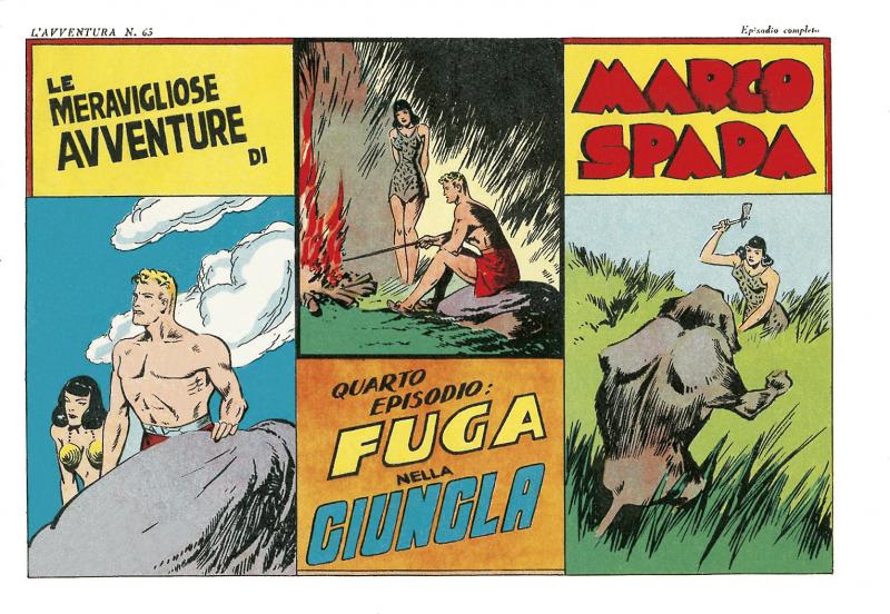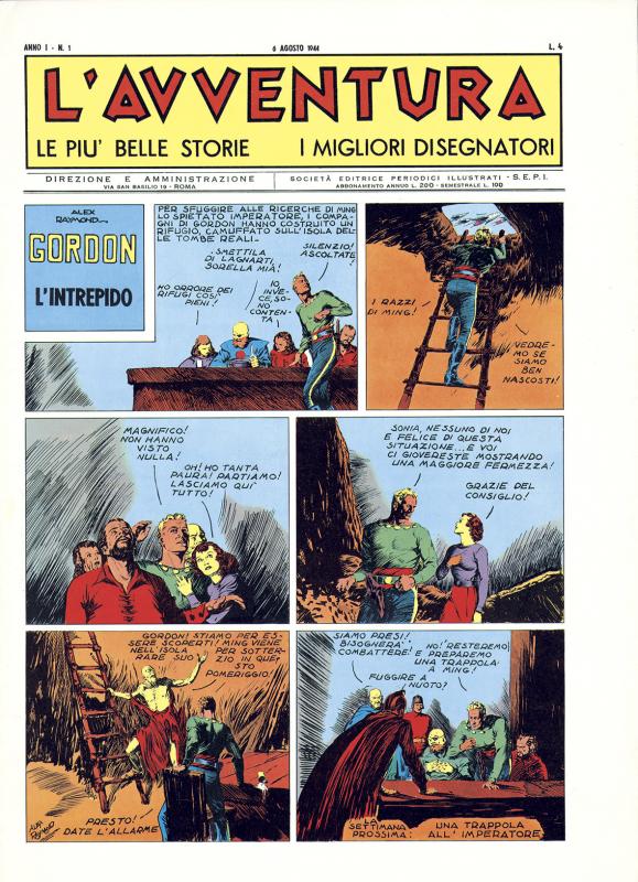 Giornale di ampio formato esce a Roma il 6 agosto 1944, due mesi dopo che le truppe alleate sono entrate nella Capitale e una settimana dopo la ripresa delle pubblicazioni da parte de IL VITTORIOSO. Lo edita Fausto Capriotti, ben presto coadiuvato dal figlio Rodolfo, che manda in stampa anche GIRAMONDO. La testata, che esordisce in formato giornale, prosegue poi fino al 21 febbraio 1952 in formato tascabile, poi assume il formato albo d’oro. Dal n. 1 della IV serie (9 gennaio 1947) diventa L’AVVENTURA ROMANTICA, ma dal n. 37 (25 settembre 1947) torna il titolo L’AVVENTURA. Continuatore ideale del glorioso AVVENTUROSO di Mario Nerbini, presenta i grandi eroi del fumetto statunitense come GORDON L’INTREPIDO (Flash Gordon) (FG) di Don Moore, Alex Raymond e poi Austin Briggs, AUDAX (King of the Royal Mounted) (AU) di Zane Grey e Jim Gary, CINO E FRANCO (Tim Tyler’s Luck) (CF) di Lyman Young, Nat Edson, Clark Haas, e Tom Massey, MANDRAKE (Mandrake the Magician) (MA) di Lee Falk e Phil Davis, JIM DELLA GIUNGLA (Jungle Jim) (JJ) di Don Moore e John Mayo, MARCO SPADA (Brick Bradford) (MS) di William Ritt e Clarence Gray, L’UOMO MASCHERATO (The Phantom) di Lee Falk/Ray Moore, Wilson McCoy, AGENTE SEGRETO X-9 (Secret Agent X-9) (X-9) di Mel Graff e STEVE CANYON (SC) di Milton Caniff. Alla chiusura di GIRAMONDO riprende RAFF di Alberto Guerri e Vittorio Cossio.