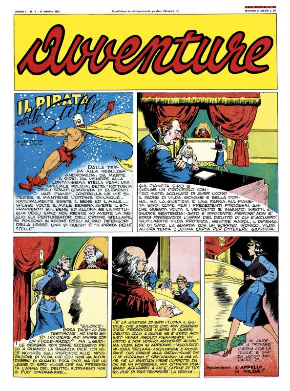 Giornale di grande formato, personaggi e serie di origine varia. Statunitense, come IL PIRATA DELLE STELLE (Star Pirate) di Len Dodson e Maurice Whitman (nn. 1/6 dal comic book «Planet Comics» della Fiction House, JIM DELLA JUNGLA (Jungle Jim) di Don Moore e Paul Norris (nn. 1/8), PETER E PAT Agenti Speciali (John Campbell) (nn. 3/8), e IL FALCO DEI MARI (The Hawk) attribuito a Willis Rensie, ovvero Will Eisner (che aveva realizzato il precedente Hawks of the Seas, pubblicato in Italia come I PREDONI DEL MARE su URRÀ!), ma presumibilmente sceneggiato da Ruth Ann Roche e disegnato da Robert Hayward Webb, dal comic book “Jumbo Comics” della Fiction House. Italiana, come Il Viaggio di MARCO POLO (Alvaro Mairani) (nn. 1/8), THUNDER JACK di Gallieno Ferri (nn. 3/8), PATTUGLIA DI FRONTIERA - CAPITAN CLARCK (Giorgio Scudellari) (nn. 1/8), TOM TOM il Pellerossa Solitario (G. De Leo/G. Molino) (nn.1/8). Francese come FANTAX (Pierre Mouchott) (nn.1/8). Dal n. 7 (23 novembre 1952) cambia la grafica della copertina che ospita un’illustrazione a tutta pagina in bianco e nero. Copertine di Verri (n. 7) e O. Uboldi (n. 8). Annunciato, ma mai pubblicato, il n. 9 . Le storie restano incompiute.