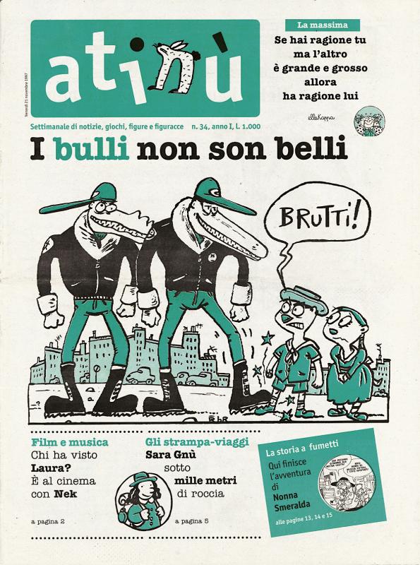SP4 - ATINÙ settimanale di notizie, giochi, figure e figuracce - 10 marzo 1997/24 ottobre 1998 - dr, Giuseppe Caldarola > Vichi De Maechi - RM 115, 1997 - 12 pgg. + cop. - cm 30 x 38 pm - Misto - Lire 500 > 1.000. Rivista contenitore con interventi di Dal Prà, Roberto Torti, ellekappa, Ciacci, Elio e le Storie Tese, Paolo Cardoni, Francesca Ghermandi, Chiara Rapaccini, Davide Toffolo, Luca Raffaelli, Alberto Rebori. Oltre a strisce, vignette e illustrazioni, pubblica a puntate i fumetti HAIAWATA PETE di Francesca Ghermandi, NONNA SMERALDA di Giovan Battista Carpi, OMERO di Davide Toffolo, BABY ALIEN di Stefano Santarelli, Massimo Vincenti e Luigi di Giammarino. La pubblicazione prosegue poi in modo autonomo.