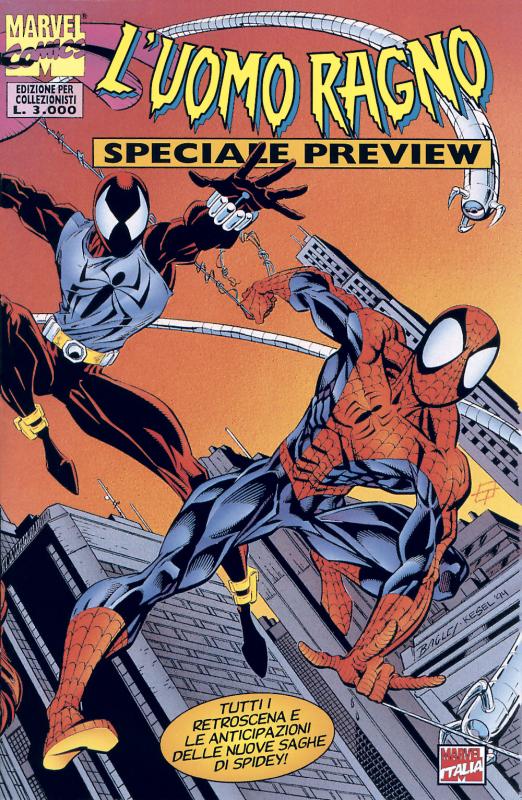 ES9 - “Speciale Preview” - suppl. a UOMO RAGNO n. 178 - 31 ottobre 1995 - Panini - 32 pgg. + cop. - cm 17 x 26 pm - 4 + 4 - Lire 3.000. Edizione in tiratura limitata riservata al circuito librario, presenta studi sul costume dei personaggi, interviste a sceneggiatori e disegnatori, pin up, inerenti la cosiddetta “Saga del clone”.