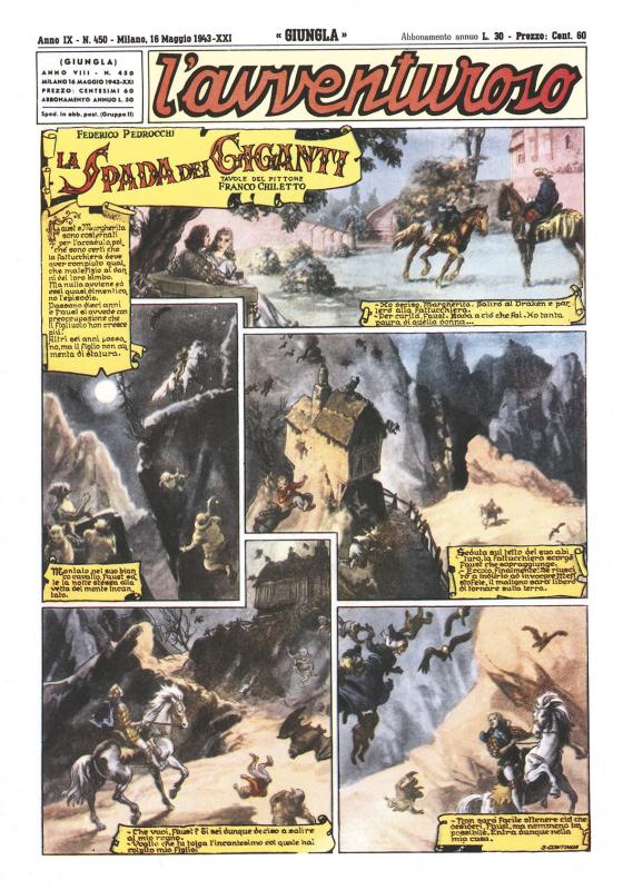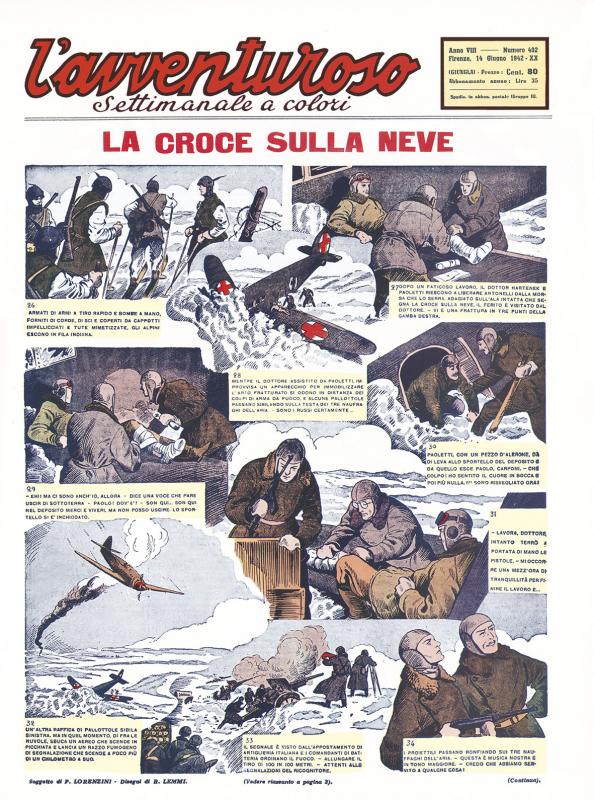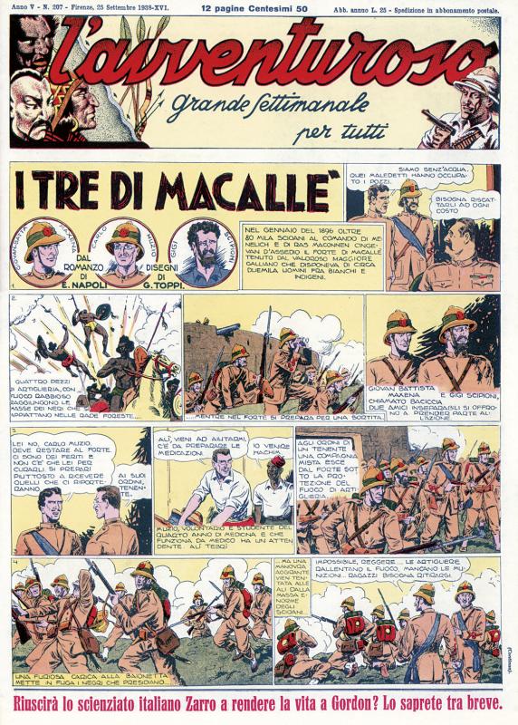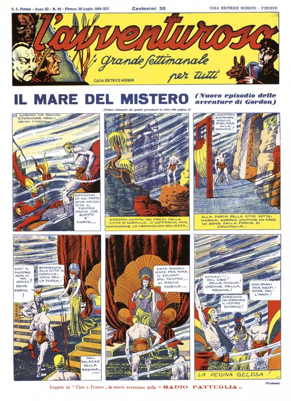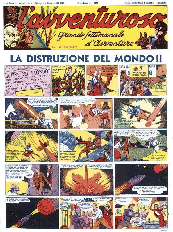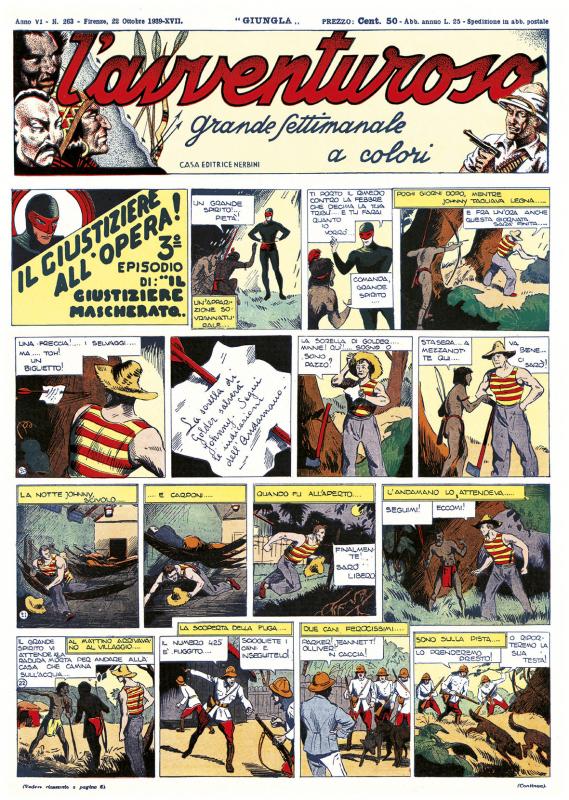 Fortemente voluto da Giuseppe Nerbini, fondatore della popolare casa editrice fiorentina, poi diretto dal figlio Mario, L’AVVENTUROSO è il primo giornale italiano interamente dedicato ai fumetti d’avventura. Sulle sue ampie pagine policrome, formato “lenzuolo”, fanno la loro comparsa i grandi eroi del fumetto statunitense, il successo è strepitoso, si parla di alcune centinaia di migliaia di copie vendute. La testata subisce nel corso degli anni varie modifiche di formato e contenuto, soprattutto a partire dal 1938 quando le direttive fasciste iniziano a vietare la pubblicazione di materiale straniero e l’uso dei balloons. L’editore, che già ha dato largo spazio ai disegnatori italiani, si concentra su storie di sapore patriottico e per un certo periodo continua a pubblicare fumetti statunitensi celati sotto nomi italiani. Quando le maglie della censura si stringono, i personaggi d’Oltreoceano vengono interamente ridisegnati dagli autori italiani: è ciò che accade all’UOMO MASCHERATO (titolo di punta del settimanale), JIM DELLA GIUNGLA, MANDRAKE e BRICK BRADFORD. Nel periodo bellico si ridimensionano di molto sia il formato sia le vendite, fino a quando la testata, poco prima di chiudere, viene acquistata dalla casa editrice Mondadori.