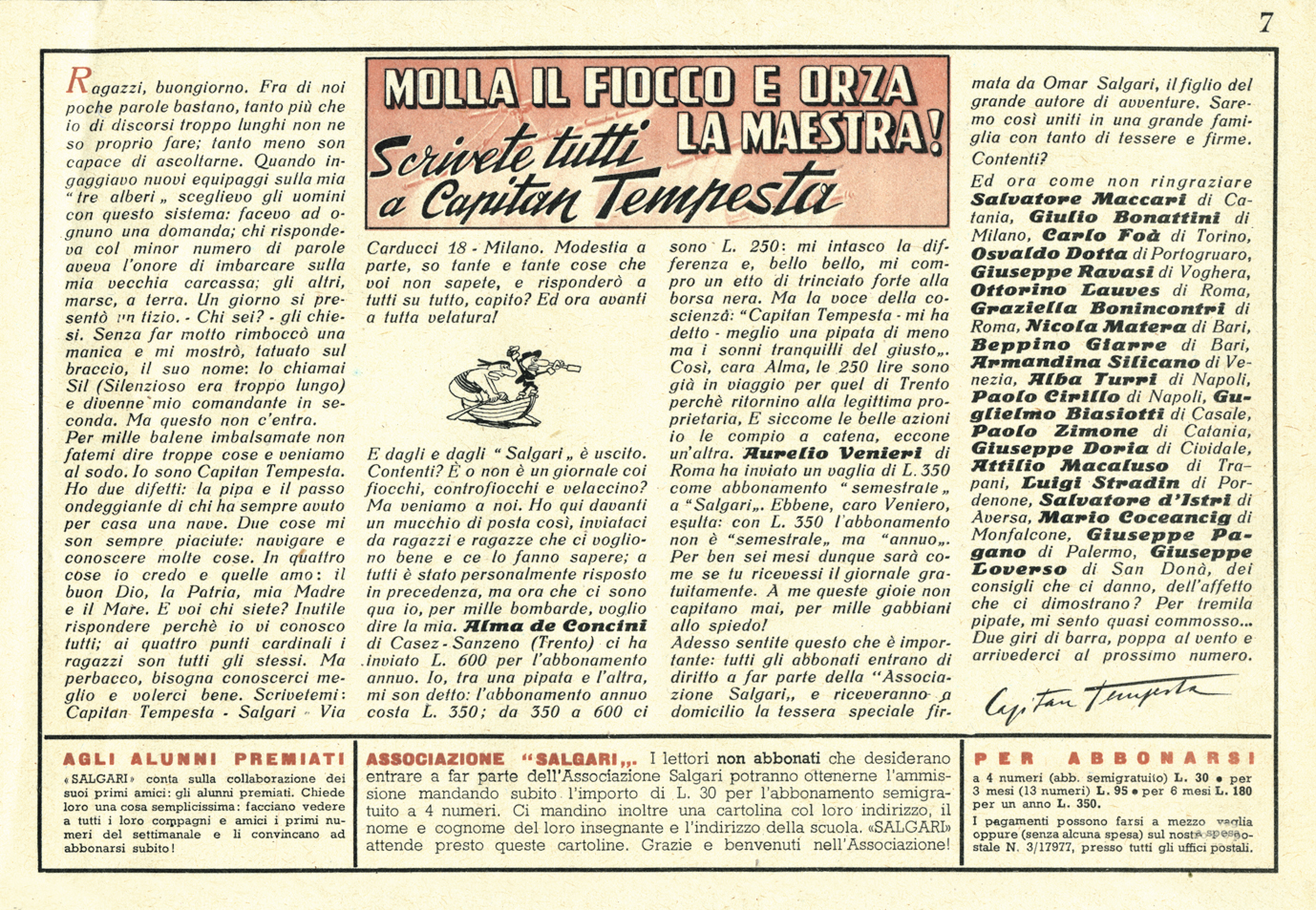 La pubblicazione del giornale avviene in due tempi diversi. Una prima serie di 30 numeri, diretta da Anna Palazzolo, esce tra Maggio 1946 e Gennaio 1947, una seconda di 28 numeri tra Dicembre 1948 e Luglio 1949. Lo stesso Vaglieri cura personalmente, come Capitan Tempesta, la posta dei lettori “Molla il fiocco e orza la maestra!”. Mentre con lo pseudonimo di Edward Bound firma varie sceneggiature e la serie Red Bill contro l’atomica, disegnata da Alvaro Mairani (Almay).