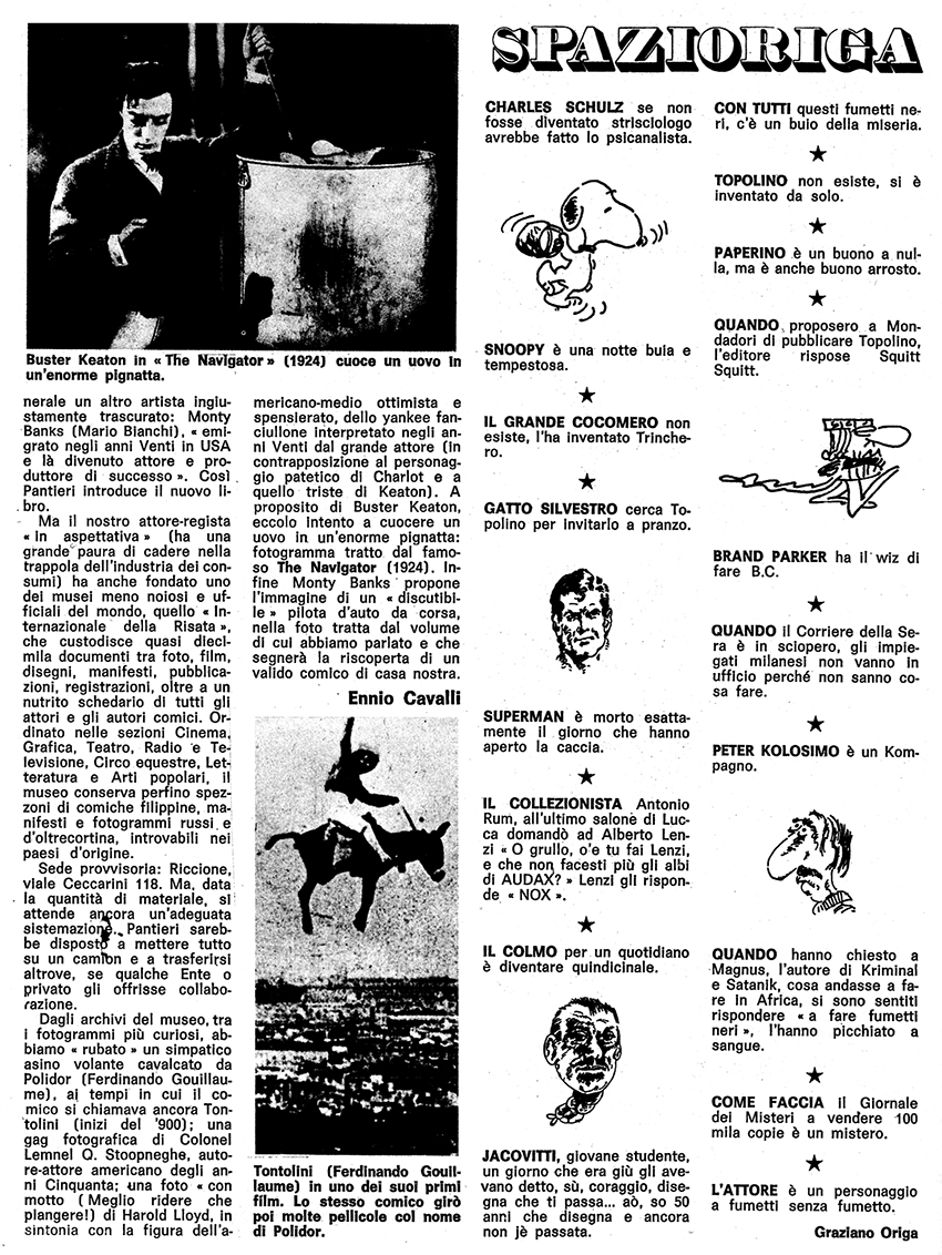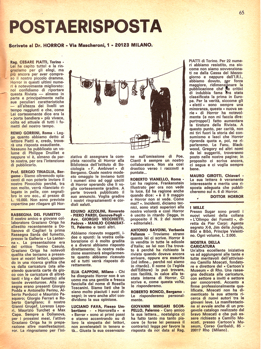 Mi ritengo una delle – certo insieme a tante altre – ultime scoperte del Dottore che, alla fine dei suoi splendori e miserie, nell'estate del 1972, mi scrisse a casa in Sardegna – di suo pugno col tono di un algido D'Annunzio o di un futurista Marinetti – subito dopo aver ricevuto delle mie tavole: «Sono lieto di annunciarle ufficialmente che il suo materiale verrà pubblicato su Horror; la aspettiamo in Lombardia, suo Gino Sansoni». E lo pubblicò veramente e io, come se la sua fosse una chiamata in guerra, nell'autunno dello stesso anno, ventenne beat, mi trasferii, destinato, a Milano.